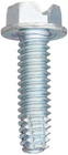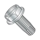 Thread cutting screw with type F point has machine screw threads that taper down to a blunt edge and is suitable for heavy gauge sheet metal, aluminum, cast iron, brass, and plastic Steel is often used in applications where strength is the primary consideration Zinc plating resists corrosion and has a reflective appearance Hex washer head has a flange for additional grip with the mating surface Slotted drive has a linear slot for use with a flat-blade driver The steel thread cutting screw has a zinc plating, a Type F point style, and a hex washer head with a slotted drive. The type F point is suitable for heavy gauge sheet metal, aluminum, cast iron, brass, and plastic. The screw has machine screw threads that taper down to a blunt point with multiple cutting edges and chip cavities. Steel is often used in applications where strength is the primary consideration. The zinc plating offers corrosion resistance and has a reflective appearance. The hex washer head has six flat sides that a wrench can grip to turn from the side, enabling use when there is no space above the head for a screwdriver. The flange acts like a washer to increase the fastener's bearing surface and distribute the clamping force over a larger area, providing grip and reducing damage to mating surfaces. The slotted drive has a linear slot for use with a flat-blade driver. Thread cutting and thread rolling screws, two types of self-tapping screws, are threaded fasteners that create a mating thread in the wall of a hole. The two screws differ from each other in the way that they create the threads. Thread cutting screws cut the wall of the hole to create the thread, creating material chips that need to be cleared away from the hole to prevent clogging. Thread rolling screws, also called thread forming screws, do not remove material but instead press against the wall of the hole to displace the material and form the threads.