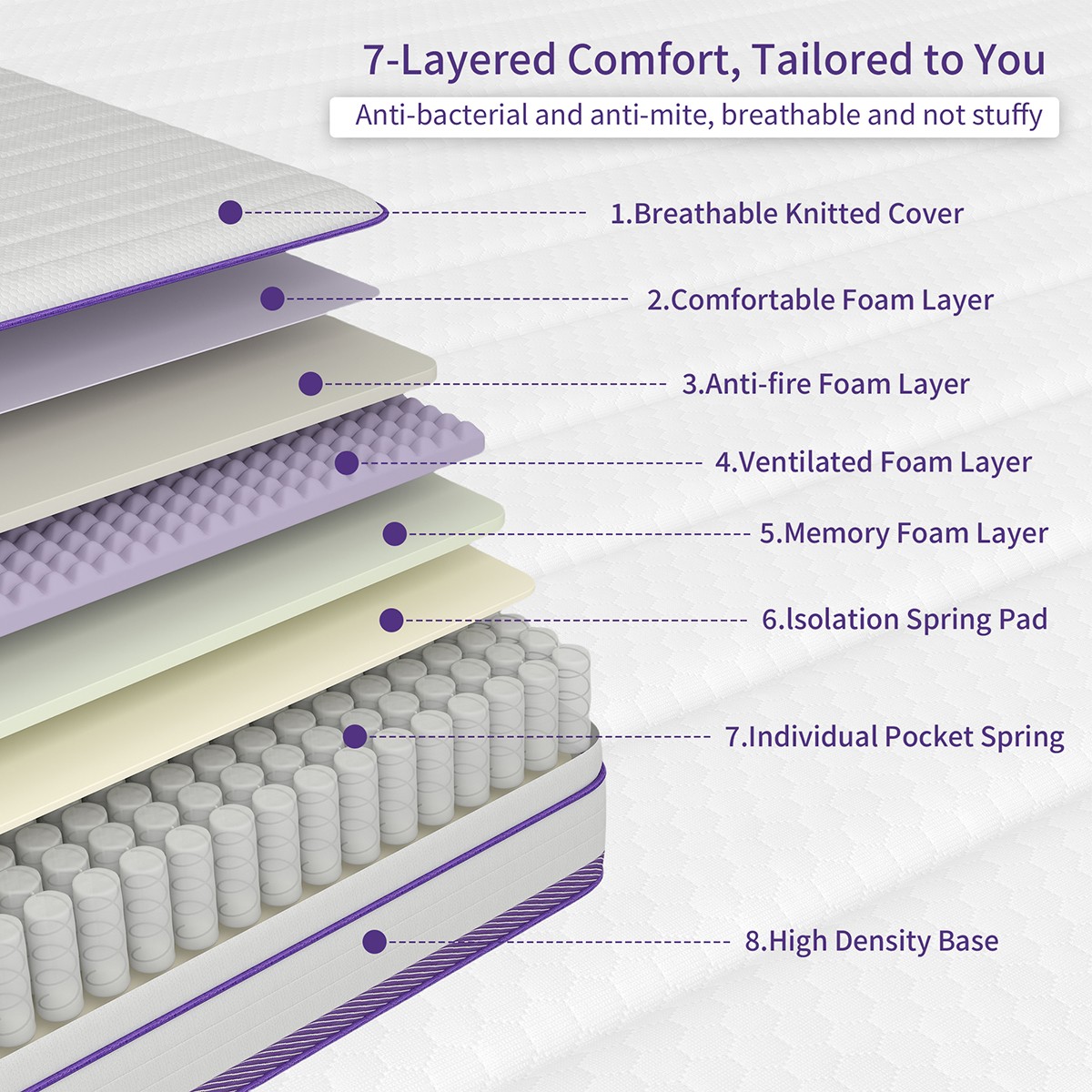 Description Hybrid Design for Tailored Comfort and Support Crafted with a perfect blend of materials, our mattress combines the best of both worlds. The upper layers are made from responsive memory foam that contours to your body, delivering a luxurious, body-hugging comfort that cradles you into a restful sleep. Beneath, an independently encased coil base layer provides targeted support, dynamically adjusting to your body weight and movement. This hybrid construction ensures that your spine remains in its natural alignment, relieving pressure points and promoting healthy posture throughout the night. Superior Motion Isolation Equipped with innovative motion isolation technology, our mattress effectively minimizes movement transfer. Whether your partner tosses and turns or gets up in the middle of the night, you’ll remain undisturbed, enjoying uninterrupted sleep. This feature makes our mattress an ideal choice for couples seeking a peaceful and restful slumber environment. Breathable Design We understand the importance of a cool and comfortable sleep surface. Our mattress is designed with a breathable structure that promotes excellent air circulation. It efficiently dissipates body heat, preventing the buildup of warmth and moisture, so you stay fresh and dry all night long. This temperature-regulating design enhances your overall sleep quality, allowing you to wake up feeling refreshed and rejuvenated. Medium Firmness for All Sleepers With a medium firm comfort level, our mattress caters to a wide range of sleeping preferences. Whether you’re a back, side, or stomach sleeper, it offers the perfect balance of support and cushioning. The medium firmness provides enough give to conform to your body’s curves while offering ample support to maintain proper spinal alignment, ensuring comfort and relaxation from dusk till dawn. Mattress in a box & Easy Setup Convenience is key, and our mattress delivers just that. Arriving in a compressed, boxed package, it’s incredibly easy to transport and set up in your bedroom. Simply unbox, unroll, and watch as the mattress expands to its full size. For optimal performance, we recommend allowing at least 72 hours for the mattress to fully expand and regain its original shape. Specification Firmness: Medium Firm Colour: White and purple Thickness: 8 in/12 in/ 14 in Material: Knitted fabric / Non-woven fabric/ High density Foam / pocket spring 2.0mm wire 8 Inch Overall dimension/Weight: Twin:75 x 39 x 8 Inch / 40 lb 12 Inch Overall dimension/Weight: Twin:75 x 39 x 12 Inch / 47 lb Full: 75 x 54 x 12 Inch / 63 lb Queen:80 x 60 x 12 Inch / 75 lb King:80 x 76 x 12 Inch / 93 lb 14 Inch Overall dimension/Weight: Twin:75 x 39 x 14 Inch / 53 lb Full: 75 x 54 x 14 Inch / 73 lb Queen:80 x 60 x 14 Inch / 82 lb King:80 x 76 x 14 Inch / 102 lb Package Content Mattress x 1 On Jul 1, 2025 at 02:21:13 PDT, seller added the following information: On Nov 24, 2025 at 20:53:25 PST, seller added the following information: