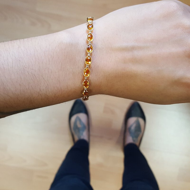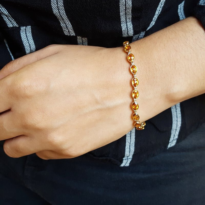 Natural Oval cut Yellow Topaz women's Tennis Bracelet in Sterling silver, November birthstone Bracelet, Party wear Bracelet, Finance gift Bracelet, Gemstone Bracelet, Tennis Bracelet. ==================================== PRODUCT DETAILS:-- Product Type - Bracelet Bracelet type - Tennis Bracelet Gemstone setting - Natural Yellow Topaz Natural Yellow Topaz shape -Oval Natural Yellow Topaz size - 6x4 mm Natural Yellow Topaz color - Yellow Setting type - Prong ==================================== The Exclusive Benefits of Yellow Topaz stone: Growth in administrative, criminal & creative careers – yellow topaz is pretty beneficial for people operating in academics, government jobs, judiciary or innovative arts. Sporting a yellow topaz stone benefits the native by boosting his innovative and realistic judgement. Financial progress & social enlistment – yellow topaz improves wearer’s will power and awareness, thereby supporting him to comprehend his goals and visions. Expert achievement and social popularity are a number of the blessings of wearing yellow topaz. Better physical and intellectual health – humans stricken by kidney and liver associated ailments are suggested to put on yellow topaz if they can’t come up with the money for yellow sapphire. Yellow topaz is also effective in coping-up with psychological disorders like despair or tension. Marital and progeny bliss – as Jupiter regulations married lifestyles and progeny, it's far believed that carrying a yellow topaz can help women dealing with delays in getting married or are struggling with bearing children. Yellow Topaz Gemstone Quality The Quality of yellow topaz is judged collectively after studying its origin, colour and readability. Any alternate, primary or minor, can notably influence on the general well worth of the gemstone. =============================================================== Guidelines for Wearing Citrine : Metal : It is usually worn in a silver ring or Bracelet . Day : Thursday is considered an auspicious day to start wearing Citrine Mantra : Reciting the mantra for Venus (“ Om Streem Brahm Brihaspataye Namah ” ) while wearing the Citrine stone is considered beneficial. ==================================== Shipping Policy :---- • Shipping Thru FedEx, DHL Express, USPS & Other Courier Services. • We ship item(s) from India to Worldwide . • We also use USP Which take 4-5 days for delivery with 100 % insured and online tracking . • We provide you each item with individually packed secured with quality products to help ensure safety and undamaged delivery =================================== Regards by RG jewels