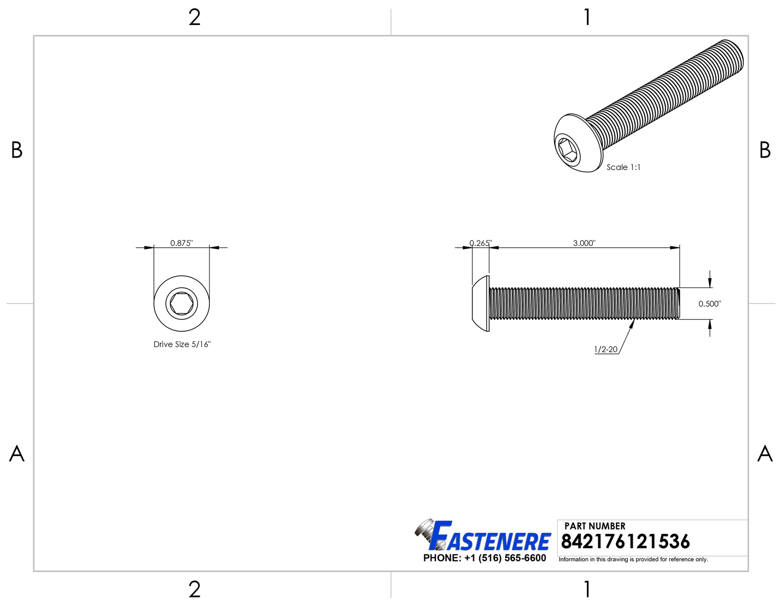 1/2-20 x 3" Button Head Socket Cap Screws Black Oxide Alloy Steel Qty 100 General Product Information Head Style : Button Drive Style : Allen Hex Key Drive Size : 5/16" Thread : 1/2-20 Length : 3" Quantity of Fasteners in Package : 100 Material Type : Alloy Steel Grade Rating : 8 Detailed Product Information: Head Diameter : Head Height : 0.265" Thread Diameter : 0.500" Threads Per Inch (TPI) : 20 Coarse or Fine Thread : Fine Thread Coverage : Full Thread Thread Length : 3.00 Key Notes: Button socket cap screws have a wide bearing surface and high tensile strength but are low profile allowing for clearance in tight spaces where there is not sufficient space for wrenches or sockets button head cap screw is recommended for lighter fastening operations and is not suggested for use in critical high strength applications where socket head cap screws should normally be used Black oxide is not a coating but a surface chemical conversion process that offers a mild corrosion resistance Fastenere black oxide button head socket cap screws are treated with a heavy water displacing oil that coats the fastener offering a greater level of corrosion resistance than most other black oxide fasteners These button cap screws are a grade 8 equivalent offering a high tensile and yield strength These fasteners have a machined thread pattern of 1/2-20 which is apart of the unified thread system Shipping: All orders placed before 3:30 pm EST Will Ship Same Day Tracking is provided on ALL Orders Priority Mail Shipping service is offered at a discount of only $3.95 UPS Ground UPS Next Day Air is available, Please inquire for pricing Returns : ALL returns are accepted if returned within 60 days. Money Back or exchange guaranteed. NO Restocking Fees. For YOU, we constantly strive to find ways of improving our performance.