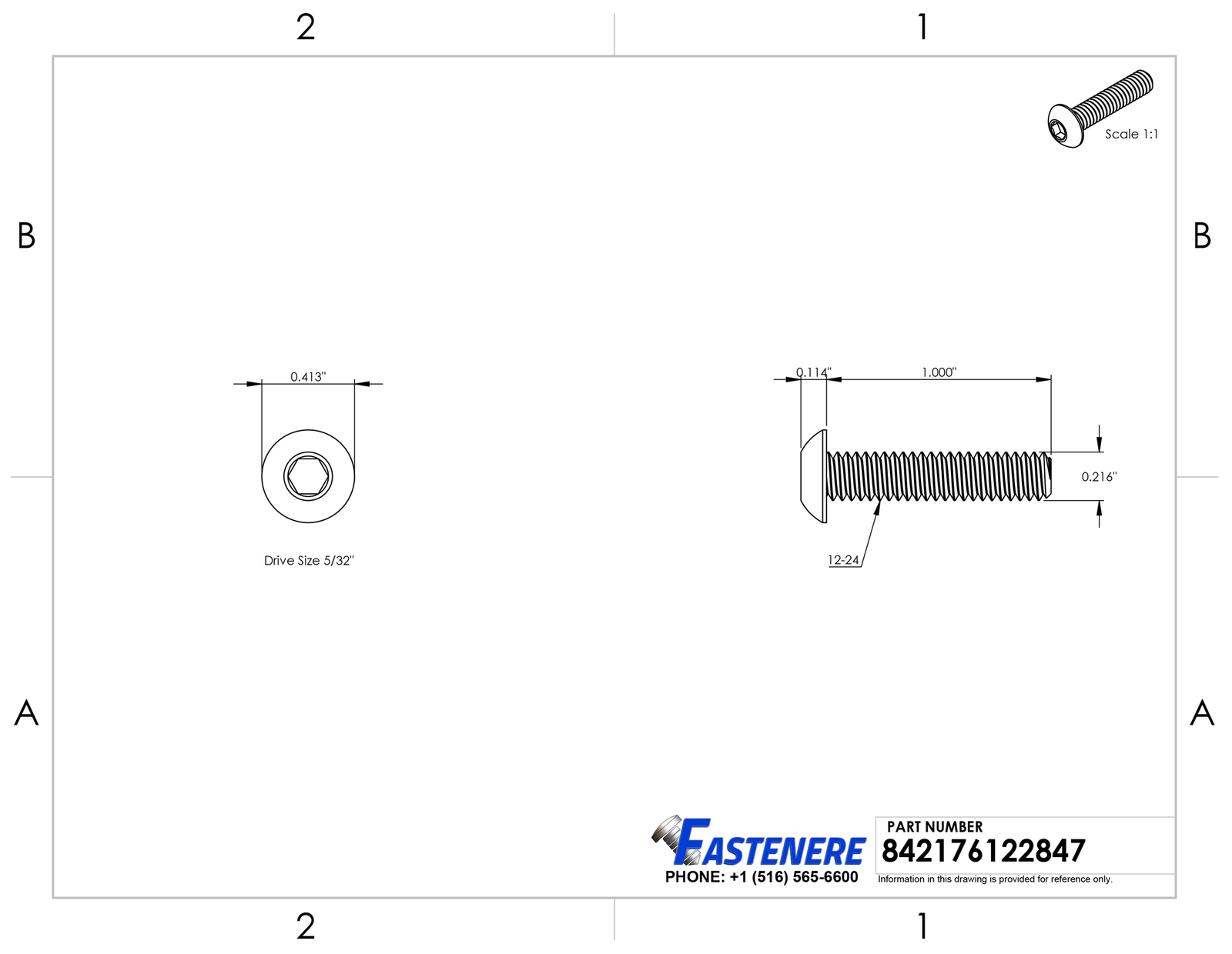 12-24 x 1" Button Head Socket Cap Screws Black Oxide Alloy Steel Qty 500 General Product Information Head Style : Button Drive Style : Allen Hex Key Drive Size : 5/32" Thread : 12-24 Length : 1" Quantity of Fasteners in Package : 500 Material Type : Alloy Steel Grade Rating : 8 Detailed Product Information: Head Diameter : Head Height : 0.114" Thread Diameter : 0.216" Threads Per Inch (TPI) : 24 Coarse or Fine Thread : Coarse Thread Coverage : Full Thread Thread Length : 1.00 Key Notes: Button socket cap screws have a wide bearing surface and high tensile strength but are low profile allowing for clearance in tight spaces where there is not sufficient space for wrenches or sockets button head cap screw is recommended for lighter fastening operations and is not suggested for use in critical high strength applications where socket head cap screws should normally be used Black oxide is not a coating but a surface chemical conversion process that offers a mild corrosion resistance Fastenere black oxide button head socket cap screws are treated with a heavy water displacing oil that coats the fastener offering a greater level of corrosion resistance than most other black oxide fasteners These button cap screws are a grade 8 equivalent offering a high tensile and yield strength These fasteners have a machined thread pattern of 12-24 which is apart of the unified thread system Shipping: All orders placed before 3:30 pm EST Will Ship Same Day Tracking is provided on ALL Orders Priority Mail Shipping service is offered at a discount of only $3.95 UPS Ground UPS Next Day Air is available, Please inquire for pricing Returns : ALL returns are accepted if returned within 60 days. Money Back or exchange guaranteed. NO Restocking Fees. For YOU, we constantly strive to find ways of improving our performance.