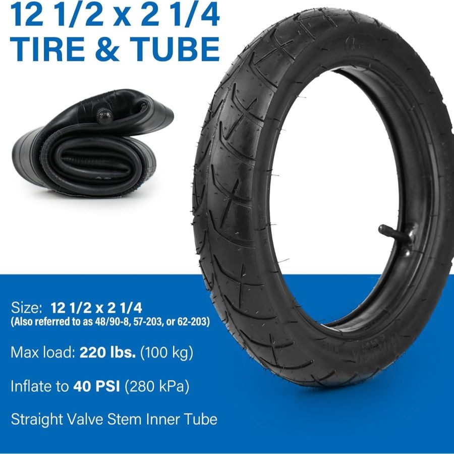12.5 x 2.25 (12-1/2 x2-1/4) Tire & Inner Tube Set for Razor Pocket Mod (Bella, Betty, Bistro, Daisy, Hannah, Sweet Pea), RSF350, Currie, Schwinn, GT, IZIP, eZip, MX125 Dirt Rocket Electric Scooters About this item SIZE: 1 Tire & 1 Tube COMPATIBILITY: This tire & inner tube set works with various electric scooters and bikes, ensuring a perfect fit for your ride. Max load: 220 lbs. (100 kg). 2 Ply Rating at 40 PSI (280 kPa) PREMIUM QUALITY INNER TUBE: Features a straight valve stem, made of butyl rubber for high air tightness and puncture resistance, reducing the possibility of air leakage while enhancing durability. INSTALLATION TIPS: Before inserting the new tube, check for sharp objects inside the tire that may puncture the tube. Inflate to the recommended PSI (usually found on the tire's sidewall). Underinflation can cause pinch flats and tire slippage on the rim. Size Description: 1 Tire & 1 Tube