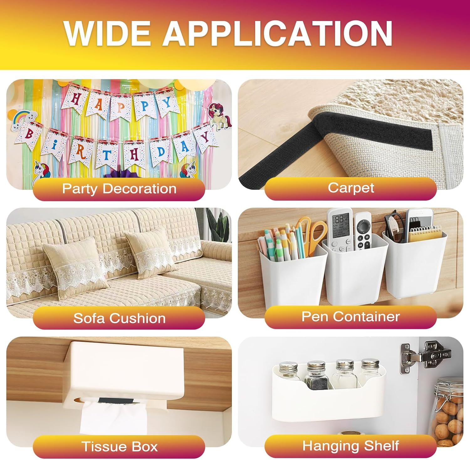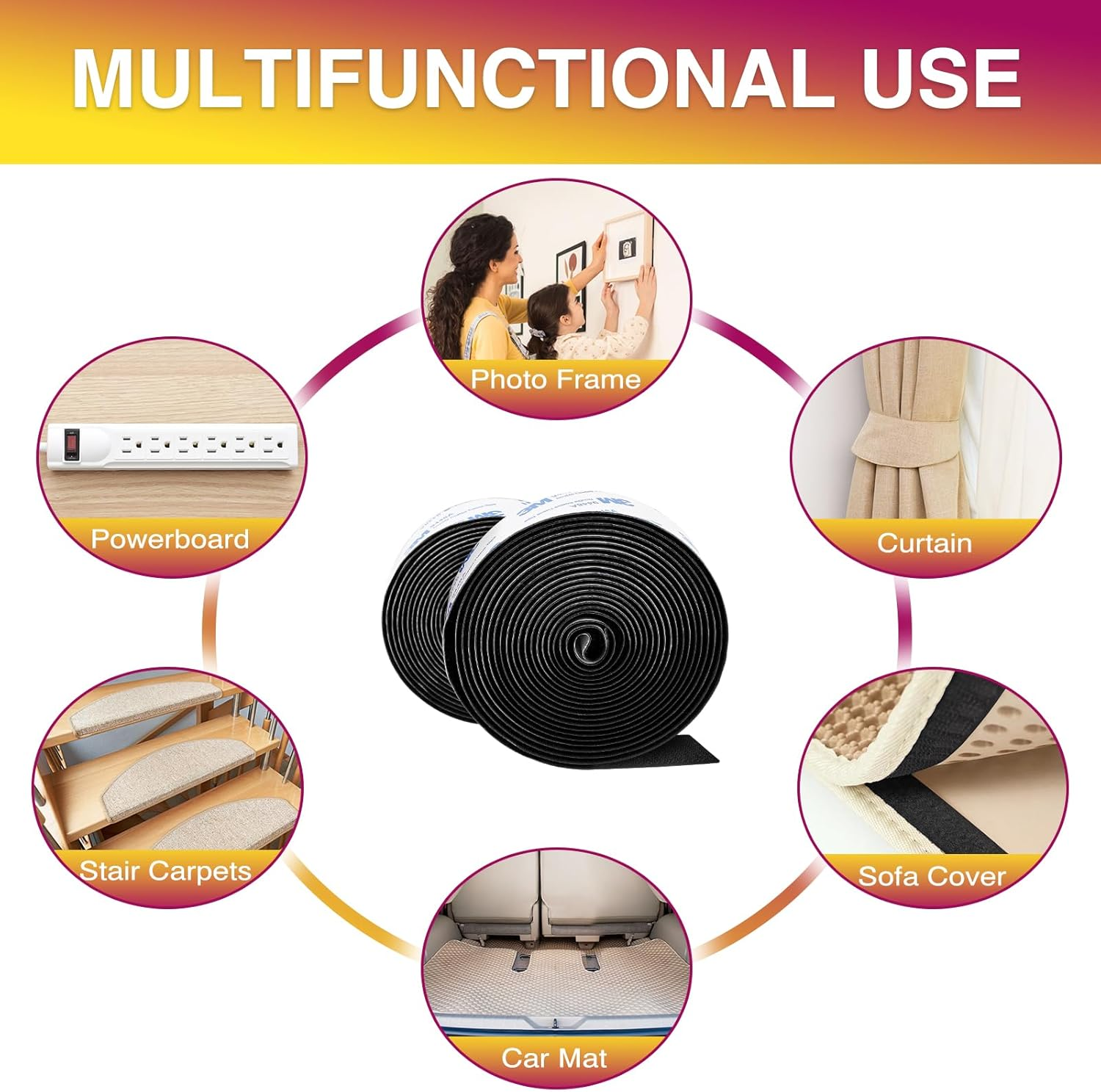 Customizable Length: With 12ft of hook and loop tape roll, you can easily cut the tape to your desired length. This double sided adhesive tape offers flexibility for various needs, whether for fastening tape for home or organizing larger projects Strong Dual-Sided Adhesive: This heavy duty self adhesive hook and loop tape features high-strength adhesive on both sides, ensuring a secure hold on various surfaces such as wood, plastic, metal, and fabric. Perfect for strong adhesive tape for walls and multi-purpose hook and loop tape applications Easy and Quick Installation: No tools required—simply peel off the backing and stick the tape. This self adhesive hook and loop tape makes installation fast and easy. It is great for cable management tape and other applications where quick, damage-free installation is needed Versatile Use: Ideal for home, office, or car applications, this hook and loop tape is perfect for securing cables, wires, decorations, wall hangings, and more. Its flexibility makes it a great solution for mounting tape for decorations and cut to size hook and loop tape for crafts and DIY projects Reliable Holding Power: This heavy-duty tape provides a firm, reliable bond that holds securely in place even under tension or weight. Whether you're using it for mounting heavier items or organizing cables, it ensures that everything stays in position without slipping or falling Product Description The video showcases the product in use. The video guides you through product setup. The video compares multiple products. The video shows the product being unpacked. 12Ft x 1 Inch Hook and Loop Tape Merchant Video