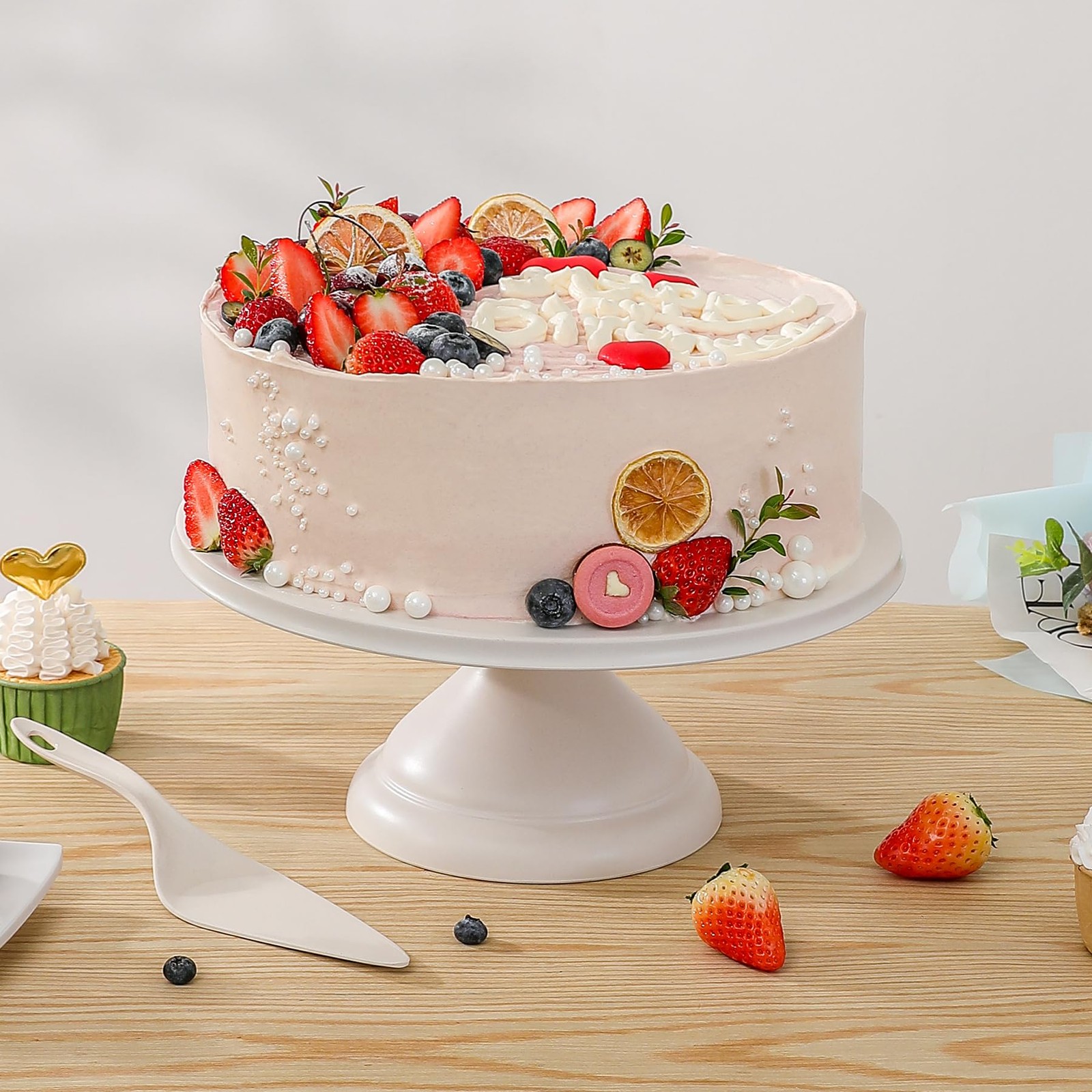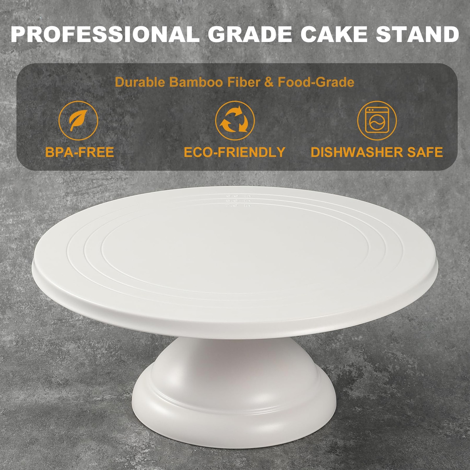This 12 Inch White Round Cake Stand with Cake Spatula Perfect for 8 inch, 9 inch, 10 inch, 11 inch Cake,modern design and elegant in shape, it can use as a cake display, cupcake stand, dessert stand or serve candies, cookies and fruit, even Bbq outside etc, it is perfect for parties, showers, holiday gatherings, weddings, birthdays, Christmas and other events. The Stand is easy to assemble, sturdiness and easy to clean. đ°ăExpand SizeăLarge cake stand for kitchen is with diameter 11.8â,height of 5.23â, suitable for cake 8 inch, 9inch,10inch, 11inch in diameter, perfect cake tray for 10inch, 11inch cake, the cake Spatula utensil are Length 9.25â and Width 2.2â, This cake pedestal is also perfect for display or serving your cupcakes, macarons, candies, cookies, fruit, or other desserts đ°ăSafety MaterialăThe round cake stand sets are made of bamboo fiber, which is thicker and more textured than plastic. More resistant to falling than porcelain. A durable material that is BPA free, as well as top rack dishwasher safe, do not microwave, Phthalates free, Heavy Metal free, PP & PVC free. Food safety and environmental protection are our philosophy đ°ăElegant DesignăThe surface of the cake plate is flat and smooth,designed for easy slicing and serving cakes. Widening and weighted base design make the pedestal cake stand more stable on the table, even while holding two-tier wedding cakes. Seamless connection of threaded structure base is more solid and stable đ°ăColorăThe cake stand and cake spatula are same color classic black and same materials, they are modern and chic enough to be your first choice for cakes. The cake stand top tray can be use as a bbq plate and the stand leg also can use as a simply cup in outside đ°ăEasy to CleanăThe round cake stand set smooth and scratch-resistant, light and sturdy. The cake tray set won't easily get stained like many plastic products. They are easy to clean and can be safely used in dishwashers or by hand wash đ°ăUsage OccasionăGreat for Birthday Party, Weddings, Baby Showers, Anniversaries, Graduation,Ceremony, Christmas Holidays and many more. Our cake stand also make lovely presents for Friends' Birthdays, New Year's gifts or Housewarming gifts for all the family. Unique cake stand design makes your kitchen or dining room modern and well organized. It is a rare gift for anyone who likes making cake,any place any time