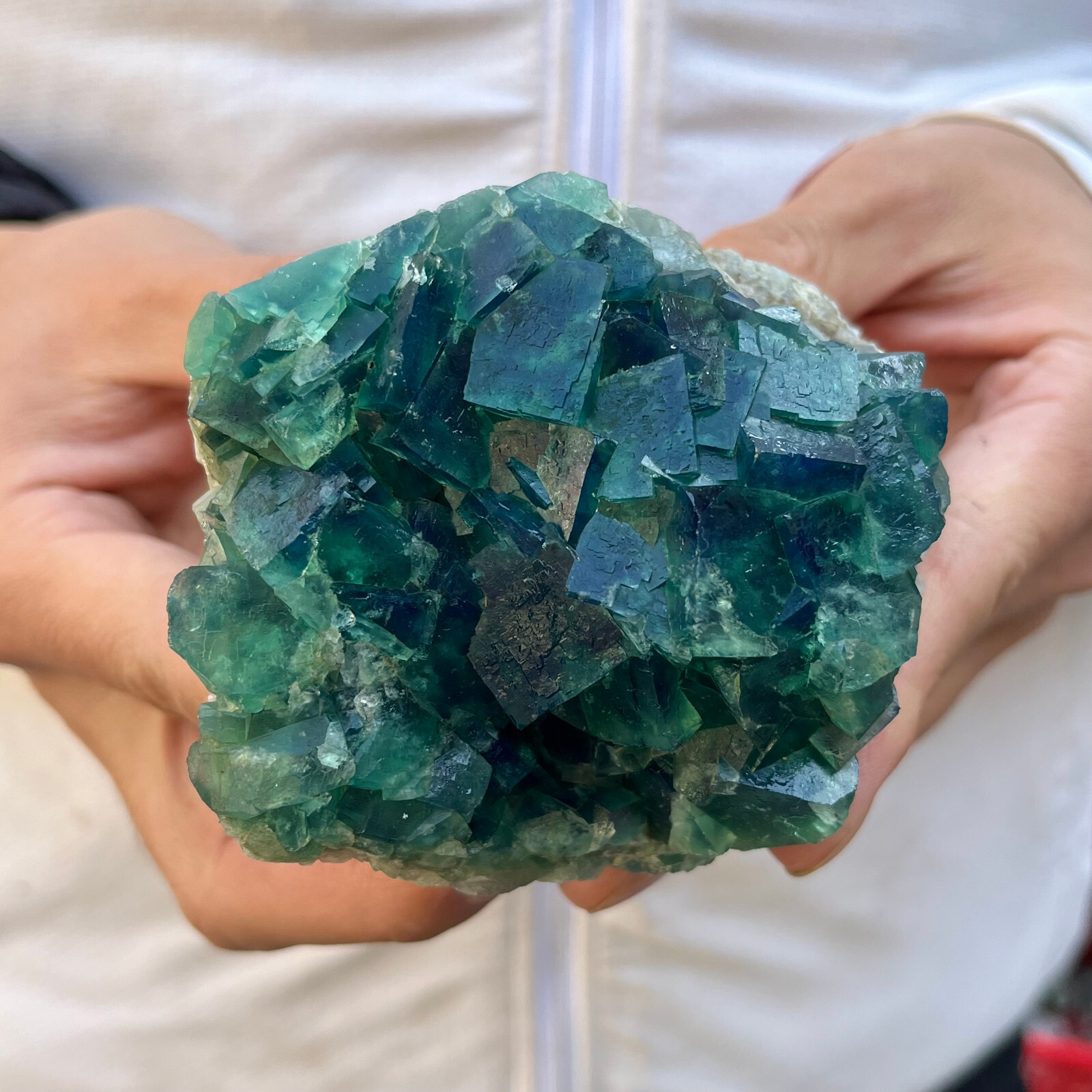 Amazing blue green hues in the fluorite. Item got here super quickly and it was wrapped completely in bubble wrap and tape. It looks exactly like the picture. It’s a solid chonk of a rock with interesting white flecks of crystal on the bottom. A+ transaction!!!
