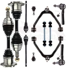 1.Notes (1).Please check the fitment chart above before payment making sure all the suspension parts listed on this page are compatible with your automobile. (2).Please refer to Moog official website before narrowing down your search so as to avoid unnecessary item not as described return requests. (3).Please contact our customer services for targeted discount after all the items are received if you have reached any targeted discount thresholds, the terms of which is at the bottom of this page. 2.Fits These Vehicles Cfspeed-autoparts 12PC Front Upper Control Arm CV Axle Shaft For Chevrolet Avalanche Suburban 1500 1.Notes (1).Please check the fitment chart above before payment making sure all the suspension parts listed on this page are compatible with your automobile. (2).Please refer to Moog official website before narrowing down your search so as to avoid unnecessary item not as described return requests. (3).Please contact our customer services for targeted discount after all the items are received if you have reached any targeted discount thresholds, the terms of which is at the bottom of this page. 2. Fits These Vehicles 2002-2006 Cadillac Escalade 2003-2006 Cadillac Escalade ESV 2002-2006 Cadillac Escalade EXT 2002-2006 Chevrolet Avalanche 1500 1999-2006 Chevrolet Silverado 1500 2007 Chevrolet Silverado 1500 Classic 2000-2006 Chevrolet Suburban 1500 2000-2006 Chevrolet Tahoe 1999-2006 GMC Sierra 1500 2007 GMC Sierra 1500 Classic 2000-2006 GMC Yukon 2000-2006 GMC Yukon XL 1500 3.Package Includes 2x Front Inner Tie Rod End -ES3488 2x Front Sway Bar End Link -K80631 2x Front Lower Ball Joint -K6541 2x Front Outer Tie Rod End -ES3493T 2x Front Upper Control Arm And Ball Joint -K80942 2x CV Axle Shaft -60-1009 Ball Joint Replacement Guideline: If there is a knocking or clunking noise in the area of the front axle when the car is traveling over road bumps, potholes or curbs, then there is usually a defect in a component of the wheel suspension. Picture(A) The side of the front axle from which the (vibration) noise is emanating can already be determined during a test drive. The type of noise also already provides certain indications for maintenance regarding which components might be faulty. Picture(B) 1.Raise the vehicle and remove the front wheels. 2.To loosen the fastening screws and fixing nuts of the compression ball joint more easily, spray them with rust remover and allow to act for a few minutes. Picture(C) 3.Loosen the fastening screws of the broken ball joint on the control arm and remove the nuts. Picture(D) 4.Loosen and remove the fixing nut of the ball joint on the steering knuckle. Tip:If the ball stud rotates, hold the ball stud in place with a hexagon socket. Picture(E) 5.Remove the bad or worn ball joint from the control arm. 6.Loosen the compression ball joint on the steering knuckle using a suitable special tool. Picture(F) 7.Clean the cone connection. Tip:For better sealing and durability of the ball joint sleeve, a little silicone grease can be applied to the contact surface. Picture(G) 8.Insert new compression ball joint in the control arm and steering knuckle and tighten with new fixing nuts. 9.Reinstall front wheels. Lower the vehicle and tighten the wheel studs to the tightening torque specified by the vehicle manufacturer. 10.Measure the chassis and adjust it using the various holes on the compression ball joint if necessary. 11.Finally, carry out a test drive. Sway Bar Stabilizer Link Replacement Guideline: While driving, the following signs may indicate a faulty sway bar stabilizer link: (1).Rattling and thumping noises on rough roads. (2).Imprecise vehicle handling. (3).Stronger inclination of the vehicle during cornering. If the sway bar stabilizer link is found to be defective, it should be replaced as described below. Picture(A) 1.Raise vehicle and remove front wheels. Tip:Always check both stabilizer links and replace them in pairs if necessary. 2.Spray fastening nuts of the stabilizer link with rust remover and let act for a few minutes. Picture(B) 3.Loosen the lower fastening nut of the stabilizer link at the stabilizer and remove. Tip:If the ball stud also starts to turn, hold it with a suitable tool. 4.Press stabilizer link out of torsion bar. Picture(C) 5.Loosen the upper fastening nut of the stabilizer link at the suspension strut and remove it. Tip:If the ball stud also starts to turn, hold it with a suitable tool. Picture(D) 6.Press stabilizer link at suspension strut out of bracket. Picture(E) 7.Insert new stabilizer link at suspension strut. Picture(F) 8.Tighten stabilizer link at suspension strut to the tightening torque specified by the vehicle manufacturer. Tip:Secure the ball stud against twisting with a suitable tool. Picture(G) 9.Insert new stabilizer link at stabilizer. 10.Tighten stabilizer link at stabilizer to the tightening torque specified by the vehicle manufacturer. Tip:Secure the ball stud against twisting with a suitable tool. Picture(H) 11.Remount the front wheels. Lower the vehicle and tighten the wheel studs to the tightening torque specified by the vehicle manufacturer. Tip:Even if replacing the stabilizer link does not directly affect the chassis setting, we recommend checking the axle setting and adjusting if necessary after working on the suspension. 12.Conclude with a test drive. Tie-Rod End Replacement Guideline: If you feel a bump in the steering when driving over road bumps or curbs, this might be due to worn tie rod ends or inner tie rods. Clicking noises during sudden steering movements can also be symptoms of a defective tie rod. In order to determine the exact cause and replace the defective tie rod, the car must be elevated with a vehicle lift in order to be examined more closely. This useful tip applies to the exchange of tie rod ends and inner tie rods, which together form the so-called tie rod. Picture(A) Note: Cleanliness is extremely important when working on the power steering. Incorrect work and contaminatio