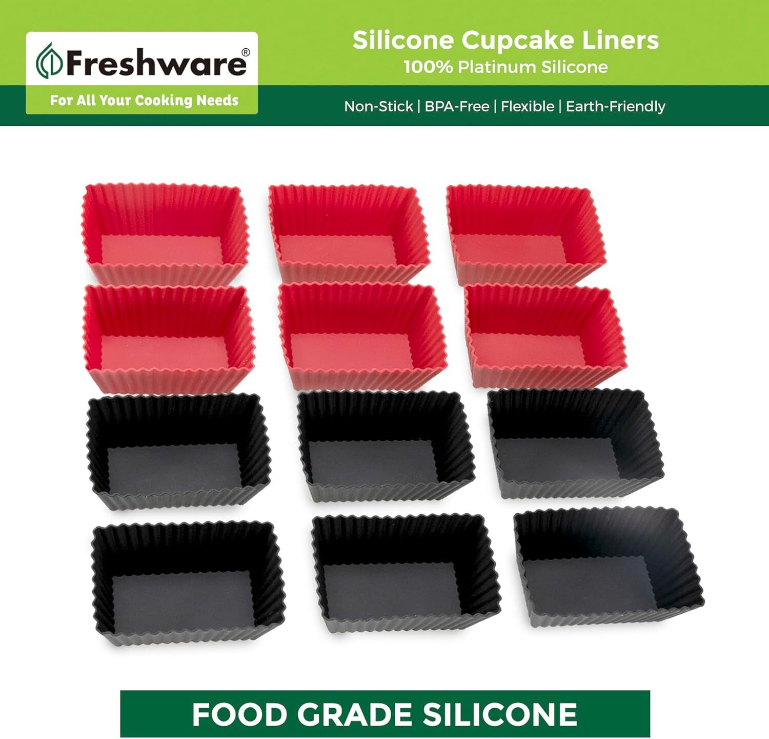From the manufacturer Your All-in-One Kitchen Companion Who says baking cups are just for baking? Use them for air frying, crafting, painting, organizing tiny treasures, or even catching drips in your car cup holders! silicone baking cups are made from 100% food-grade silicone, BPA-free, non-toxic, and totally reusable - so you can ditch those single-use liners for good. These flexible silicone baking cups are perfect for a wide range of treats, including muffins, mousse, bread, pudding, tarts, jelly, brownies, chocolate, custard, fat bombs, and even homemade soaps. Each set comes beautifully packaged, making it a thoughtful, practical gift for anyone in your life. Easy to Release and Clean Crafted from food-grade silicone, these baking cups are both flexible and long-lasting. Their non-stick surface, along with stain and odor resistance, makes cleanup a breeze. Dishwasher-safe. Air Fryer and Oven-Safe Made from high-quality food-grade silicone, baking cups can endure temperatures from -40°F to 450°F, making them ideal for freezing, baking, and reheating in the microwave, air fryer or oven. Great for Lunch Boxes Keep your lunch organized - separate snacks, sauces, and more with ease. Our silicone baking cups come in all kinds of sizes to fit your style. Perfect for Any Occasion Ideal for all kinds of occasions - weddings, birthdays, baby showers, parties, catering events, marathons, and festive baking for Halloween, Thanksgiving, and Christmas. Product Description Reusable Silicone Baking Cups. A great alternative to disposable paper baking cups, this reusable silicone baking cups can be used again and again. The baking cups work with any standard muffin pan, and depending on the batter, they can also be used freestanding on a flat cookie sheet. 100% Pure Silicone - BPA Free, no Additives, no Fillers. While other brands use plastic fillers and toxic materials that leave behind a plastic taste and smell, our silicone muffin pans are 100% PURE SILICONE and BPA free, with no additives and no fillers! We use only the Best, Non-toxic, US and European food-grade silicone in our molds. We’ve taken the time to source better quality silicone to ensure the quality surpasses normal standards and brings you a truly remarkable product. Not only are the muffin pans made out of premium silicone, but they are also heat resistant up to 446°F or 230°C. The reusable baking cups offer exceptional versatility in the kitchen. Use them to make not only muffins and cupcakes, but also molded gelatins, cheesecakes, brownies, and other delicious desserts and treats. Beyond baking, the colorful cups can also be used to hold snacks, cookies, cakes or candy for a kid’s party. Separate foods in Bento Lunch Boxes! Great for ice cream and large ice cubes! Make handmade soap, candles and bath bombs! Safe, Easy, and Clean Use! On top of being made from the highest grade materials possible, our silicone muffin pans are also dishwasher, microwave, freezer & oven safe. What You Get: ✅ 1x 12-Cup Silicone Baking Cups, Standard Round. ✅ Size: 2.8 x 1.8 inch top, 2.1 x 1.2 inch bottom, 1.1 inch depth. Volume: 12 x 2.2 oz, Total 26.4 oz.