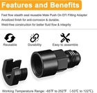 Interchange Part Number: KT00914AN6BK-HW Features: Easy Installation Performance Part: Yes Connector Type: Female Connector Color: Black Brand: EVIL ENERGY Warranty: 2 Year Color: Black Type: EFI Fitting Manufacturer Part Number: KT01211S1BK-HW Fuel Type: Dual Fuel Universal Fitment: Yes Country/Region of Manufacture: China Placement on Vehicle: Right, Left, Front, Rear UPC: Does not apply Material: Aluminum Manufacturer Warranty: 2 Years gtin13: Does not apply