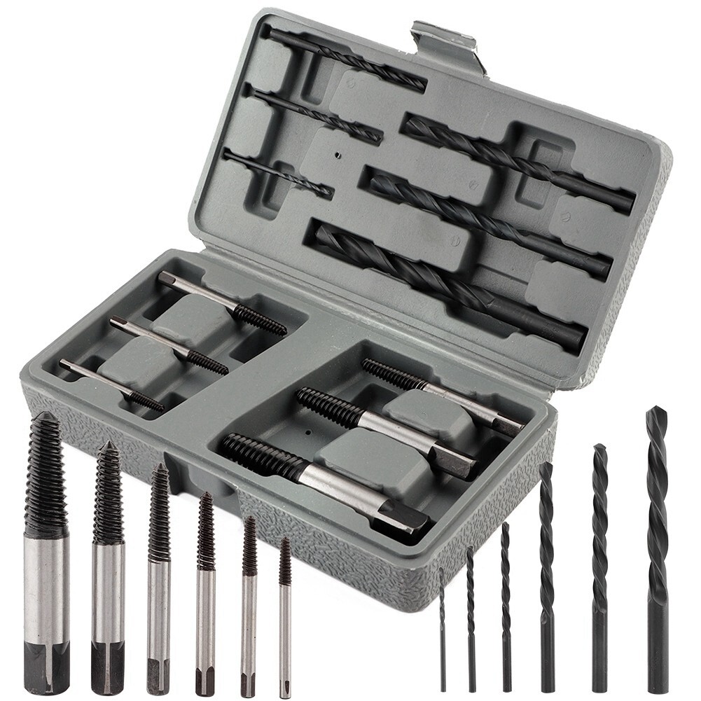 Feature: 1. These extractors will remove most kinds of damaged, rusted, broken or stuck screws from any wood or metal . 2. Made from HSS 4241 and black oxide coated for extra hardness and long durability. Produced from GCr15 bearing steel. 3. 6 pieces heavy duty screw extractor with different sizes to meet multiple needs. 6 pieces high hardness drill bits functions good for drilling. 4. Drill bits can also be used to bore holes on wood, metal, plastic, brick and wall, etc. 5. Easily remove damaged or broken screws, bolts, studs, threaded pipe fittings and so on. Specification: Features: These extractors will remove most kinds of damaged, rusted, broken or stuck screws from any wood or metal . Made from HSS 4241 and black oxide coated for extra hardness and long durability. Produced from GCr15 bearing steel. 6 pieces heavy duty screw extractor with different sizes to meet multiple needs. 6 pieces high hardness drill bits functions good for drilling. Drill bits can also be used to bore holes on wood, metal, plastic, brick and wall, etc. Easily remove damaged or broken screws, bolts, studs, threaded pipe fittings and so on. Specification: Condition: 100% Brand New Material: Secondary Construction, HSS drill bits Type of Thread: Reverse spiral, tapered, coarse thread Color: As Picture Shown Screw Extractor: 3-6, 6-8, 8-11, 11-14, 14-18 and 18-25 Drills: 3/32, 1/8, 3/16, 1/4, 5/16, 3/8inch Package list: 6 * Screw Extractors 6 * Drills Bits 1 * Plastic Case