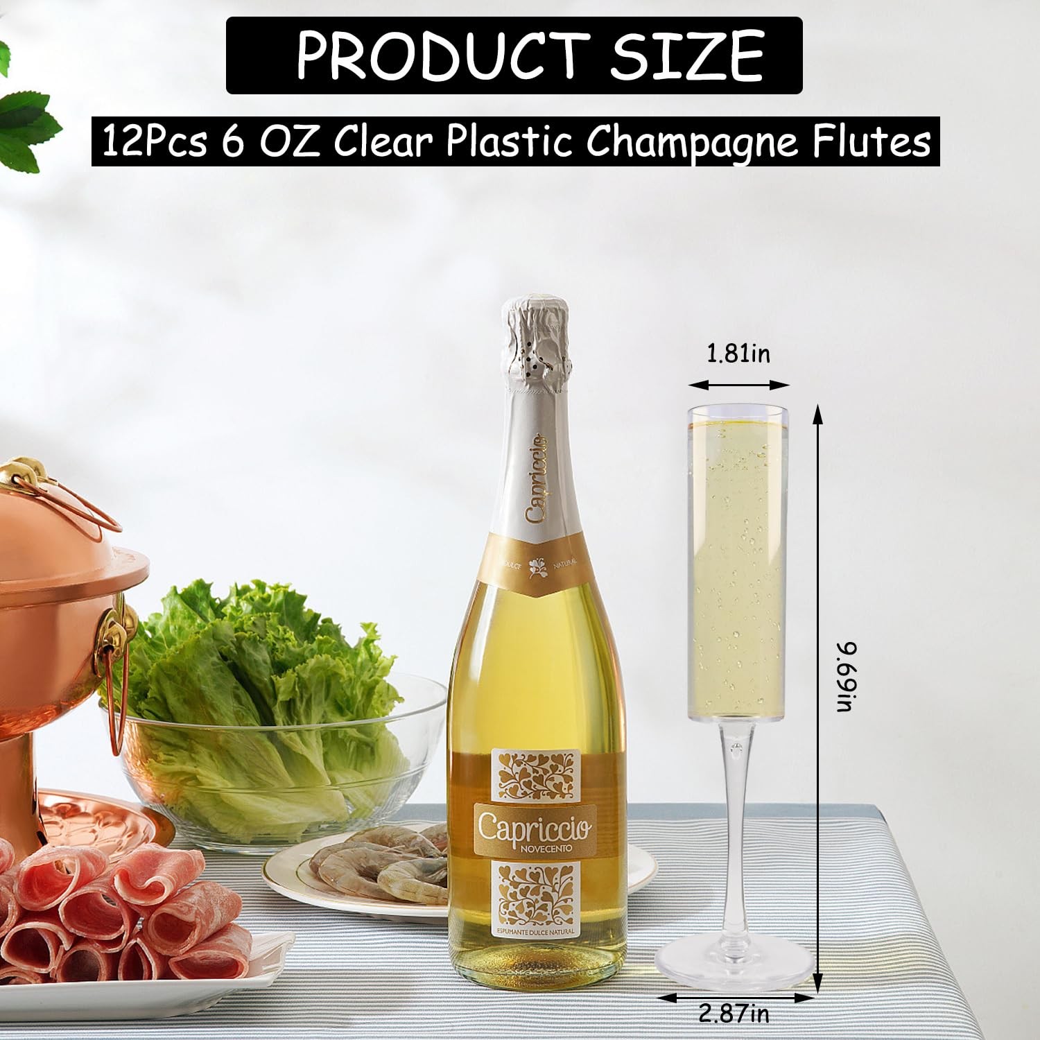1 【Elegant Plastic Champagne Flutes】: Our plastic champagne glasses are made of heavy duty, shatterproof, bpa free plastic that is unbreakable and drop resistant. Plastic clear champagne flutes are reusable, making them a great choice for parties. Note:Not suitable for dishwasher use,or microwave use 【Value Package】: You will get 12 pcs acrylic clear Champagne Flutes, these disposable champagne glasses measure 9.69x1.81x2.87 inch with 6oz capacity, plentiful and right size, perfect for you to host your family and friends party 【Easy to Clean】:This plastic champagne glass has a smooth surface and is very easy to clean, a rinse with water and a wipe with a damp cloth after use will remove any dirt or stains, saving you time and energy and allowing you to focus on enjoying your leisure time 【Perfect Gift】: These plastic long stem champagne flutes are delicate, charming and luxurious, can be used as a unique gift for your family, friends, it will impress everyone, it is a unique gift to celebrate important moments 【Worth Having】:These plastic disposable champagne flutes are perfect for hot and cold drinks, making them ideal for everyday use, parties, or outdoor events. Goblet glass are suitable for a variety of drinks such as wine, champagne, whiskey, mimosas, sparkling cocktails, and more