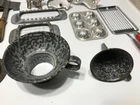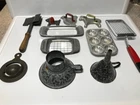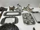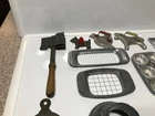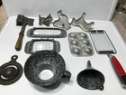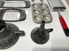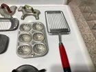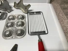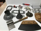 12 various vintage kitchen items. I added the strainer and forgot to get it in the big picture. 3 cookie cutters. One butter slicer. Not sure what the other slicer is for.Childs muffin tin. Wood handle meat beater. 2 funnels. Wooden paddle. Dexter bowl scraper.Red handle slicer. Nice variety for someone who likes vintage kitchen items.
