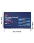 T5, T6, T7, T8, T9, T10; PH000, PH00, PH0; SL1.5, SL2.0, SL2.5 Pack with paper box Set includes: 12-Pieces mini screwdrivers with sizes of - T5, T6, T7, T8, T9, T10 torx star Screwdriver; PH000, PH00, PH0 Phillips Screwdriver; SL1.5, SL2.0, SL2.5 Slotted Screwdriver. Size: The screwdriver measures the total length 5.51 inch/140 mm, the bit length is 1.96 inch/50 mm. Non-Slip Handle: The swivel end cap of the precision magnetic screwdriver allows constant finger pressure while driving, and the non-slip rubber grip offers maximum turning power. High-Quality: screwdrivers are made of heat-treated chrome vanadium steel, having good anti-corrosion performance, stronger and tougher than most carbon steel, significantly increase the durability. Multipurpose: 12-Piece precision screwdriver is an ideal choice for your daily maintenance of electronic products, mobile phones, watches, glasses, jewelry, toys and other precision items
