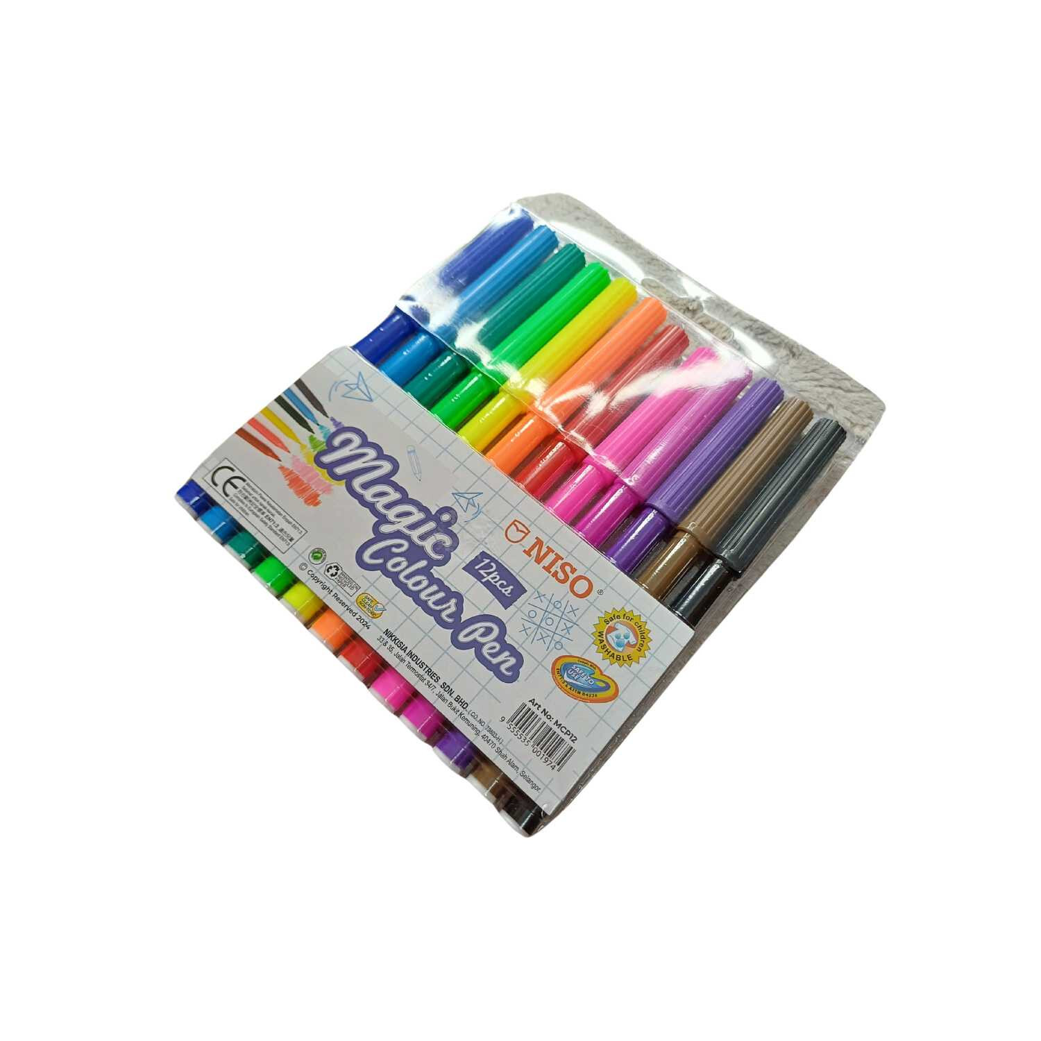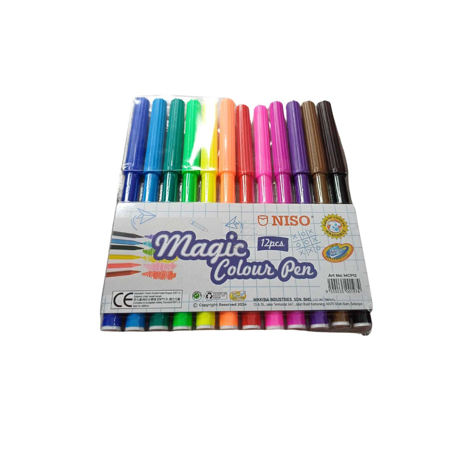 Enhance your creativity with the 12-piece Niso Magic Color Pen set. This set includes multi color pens that are safe for children and washable. Perfect for art enthusiasts, this set is ideal for drawing and lettering supplies, and is a great addition to any art supplies collection. The Niso Magic Color Pen set is designed to provide you with a comfortable and seamless writing experience. These pens are perfect for creating beautiful and vibrant colors that will bring your ideas to life. Get your hands on this amazing set today and unleash your creativity!