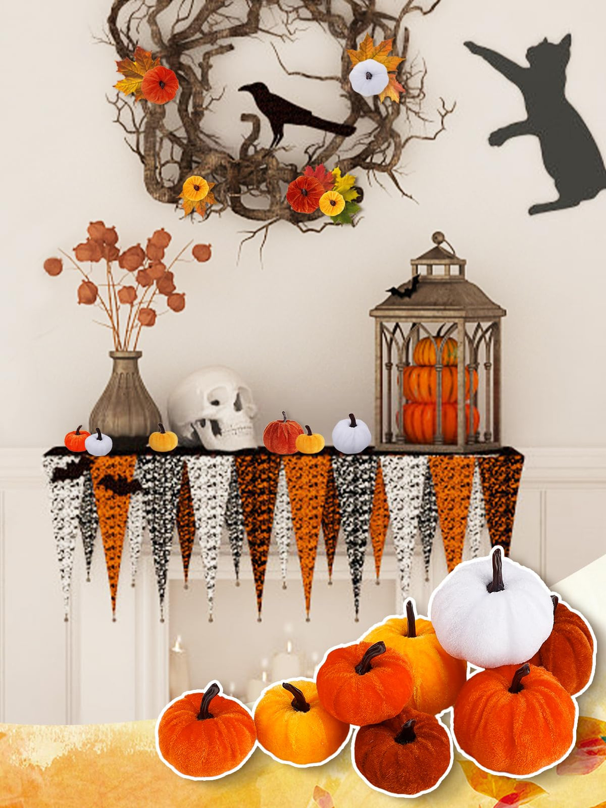 Do you want to make your house better decorated for autumn? Do you want to prepare a unique fall dinner for your friends and family? Do you want to spend a more memorable Thanksgiving Day? Try these elegant assorted fabric pumpkins! Product Specifications Shape: Artificial pumpkins Material: Velvet and foam Color: Orange, yellow, white, brown Dimensions: 2.7in x 2in, and 2.2in x 1.4in Package: 12 fabric pumpkins Product Feathers High-Quality Materials Pumpkins symbolize harvest and abundance, and the velvet material enhances their luxurious appearance compared to plastic alternatives. Perfect for Festivals and Fall These pumpkins are perfect for fall, Halloween and Thanksgiving, providing a farmhouse festive touch as you prepare your home for the celebrations. Symbol of Abundance Bring the spirit of autumn into your home with these delightful velvet pumpkins, and enjoy a season filled with warmth, color, and charm! Vibrant Fall Colors: This set includes 12 velvet artificial pumpkins in 4 autumn-inspired colors: orange, yellow, white, brown. These pumpkin colors symbolize autumn and complement the red and yellow hues of autumn leaves, capturing the season's sight and atmosphere. Exquisite Designs: Crafted from foam and wrapped in luxurious velvet fabric, these assorted fabric pumpkins offer a rich, sophisticated texture. The realistic design, complete with a natural-looking stem, adds an elegant touch to your fall decor, making them a standout piece for any setting. Ideal Autumn Decorations: Perfect for autumnal home decor, these charming velvet pumpkins enhance any space. Use them to decorate dining tables, fireplace, wide-mouthed vases, wooden bowls, decorative tiered trays, bringing a cozy, festive feel to your home. The Right Size: You will receive four small pumpkins, each 2.7 inches in diameter and 2 inches tall, and eight smaller pumpkins, each 2.2 inches in diameter and 1.4 inches tall. Different sizes of pumpkins will create a more layered autumn decoration effect. Easy to Clean: These farmhouse pumpkins decorations are easy to maintain. They resist stains and can be effortlessly wiped clean or washed to keep them looking pristine. Enjoy a fall filled with warmth, color, and charm with these delightful velvet pumpkins!