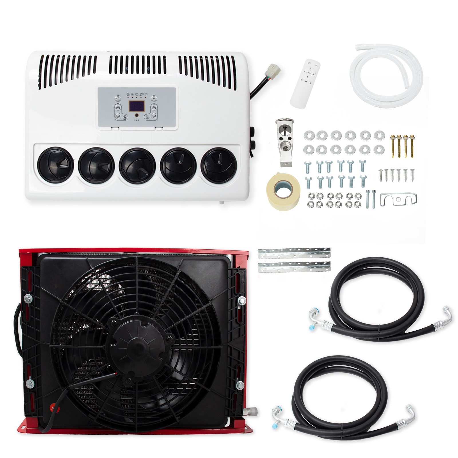 This electric air conditioner is operated by a battery (generator). You can still use the air conditioner even when the engine is off. Low noise, energy saving and environmental protection is your best choice. Save thousands of dollars in fuel bills each year. Energy saving, economical, environmental protection, no pollution Air conditioning parameters: Voltage: 12V. Startup current needs 75A. Power: 850W. Cooling capacity: 11000BTU. Add R134a/600g. The outdoor unit can be installed vertically behind the front of the car, or can be installed horizontally on the roof. The parking air conditioner runs when the engine is off to cool the cabin, which will protect your engine from idling. Instead of consuming fuel, it can be powered by a battery or generator. 12V DC compressors are safer and quieter than high voltage compressors that run with inverters. Inverter air conditioners will monitor battery conditions and operate accordingly, reducing energy consumption. DC Power: The DC electric air conditioner uses a high-efficiency electric scroll compressor and is powered by the vehicle battery. It keeps your cab cool even when the engine is off. Suitable for trucks, RVs, vans, excavators, passenger cars, agricultural vehicles, engineering vehicles, ships, etc. To give drivers plenty of rest and increase safety on the road, our powerful air conditioning system ensures pleasant temperature and humidity and creates an ideal climate for electric parking cooler systems for trucks, buses, vans, motorhomes. High-quality components set high-quality standards for parking coolers and ensure a long service life with minimal maintenance. Electric parking cooler reduces engine idle time, saving fuel. Low pressure cutoff ensures engine start. ATTENTION: 600 g R134A is required to be CHARGED into the air c ondition er machine ,if you think 600 g is not enough and want to make the machine make more cooler air,you may charge more R134A ,and the max is 750 g. SIZE OF OUTDOOR UNIT:L:520 * W:420 * H:210 (mm) / L:20.5 X W:16.5 X H:8.25 - inches,48 lb SIZE OF INDDOR UNIT:L:430 * W:320 * H:190 (mm) / L:16.9 X W:12.5 X H:7.5 - inches, 12 lb F eatures : 1. Thick aluminum condenser, anti-corrosion aluminum, good ventilation and heat dissipation, fast flow rate and fast cooling 2. Stainless steel shell, corrosion-resistant, no deformation 3. Save fuel and electricity 4. Remote one-button control 5. Intelligent frequency conversion 6. Super large air volume, silent air, 360 degree air supply, three gear options 7. Large air outlet 8. High-quality screw fittings, fine workmanship 9. Automatic transmission, rapid cooling, long standby time 10. Automatically adjust the temperature according to room temperature Specification: Powered by the battery of the Truck car. 1. Color: red 2. Rated power: 300-850w 3. Rated current: 40-70A 4. Undervoltage protection: 11.4 5. Protection level: IP * 4 6. Freezing medium: R134a 7. Voltage: DC 12 V 8. Air volume: 500m³ / h 9. Cooling capacity: 11000 BTU 10. Undervoltage response: 10.6-11.4v 11. Control method: remote control 12. refrigerant-capacity: 600g-750g ( R134A ) 13.battery cables:7 awg (if the cables are too short for you,you can buy a 100A anderson connector and extra two 7awg cables to make it longer enough ) 14. Applicable models: heavy trucks, light trucks, construction vehicles, excavators, ships, touring vehicles, refrigerated vehicles, etc. 15.suggest battery:12v/150a or better Package Includes: 1 Set Air Conditioner