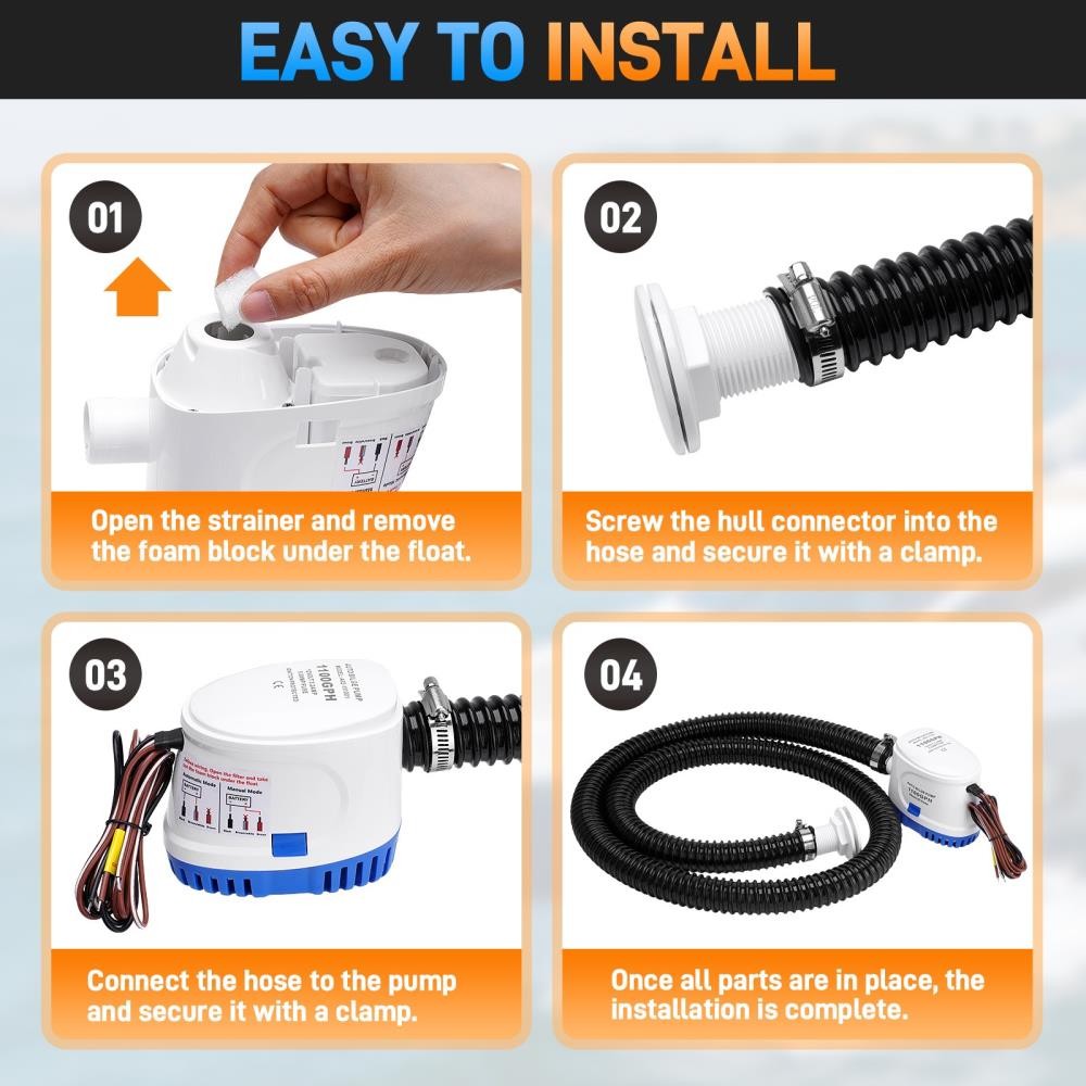 DESCRIPTION WIDE APPLICATION: The bilge pump is used in a wide range of Marine environments, including fishing boats, cruisers, speedboats, yachts, kayaks and more, built for harsh Marine environments to withstand the most adverse conditions AUTOMATIC BILGE PUMP: Our 12V pumps do not require a separate float switch and have a built-in electronically controlled reed sensor system for fully automatic operation. With a capacity of 1100 gallons per hour, ensure fast and efficient water removal to keep your boat dry and safe PACKAGE INCLUDED: Bilge pump plumbing kit includes auto bilge pump, 6 FT of 1-1/8 inch diameter hose, 2 sturdy clamps, thru-hull connector and instruction. Everything you need for a quick and hassle-free installation DURABLE CONSTRUCTION: Made with high-quality, corrosion-resistant materials, this bilge pump is designed to withstand harsh marine environments, ensuring long-lasting performance and reliability PERFECT FIT: With straightforward instructions and all necessary components included, the bilge pump kit is easy to install. Package Includes: 1 X Bilge Pump Plumbing Kit