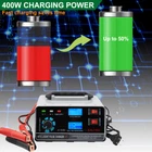 12V/24V 400W Heavy Duty Car Truck Battery Charger Intelligent Pulse Repair Trick Item Description Description The charger with the metal housing is more durable and has a long service life. When the battery is fully charged, it will automatically stop charging to prevent damage to the battery. The charger with the pure copper wire high-frequency transformer is more efficient and durable than one with the old-style coil. It is suitable for charging the batteries of various cars, motorcycles, vans, and trucks. The charger can charge the 12.6V lithium battery and the 12V or 24V ordinary battery. Key Features Faster Charging: This charger has a faster-charging speed because of the 400W power, which can reduce your waiting time. Safe to Use: The high-quality charger provides short-circuit protection. It can stop charging immediately if there is an abnormality, such as a short circuit in the charging, which is safer to use. Protecting the Battery: The five-stage pulse repair charging will hold continuous restoration during the charging so that the battery is not damaged. Battery Dual Mode: It can adapt to two kinds of batteries. The left wire can charge lithium batteries, and the right can charge ordinary batteries. Automatic Recognition of Winter Patterns: Even in cold places, you don't have to worry about battery charging because it automatically recognizes winter mode, so it is also suitable for cold areas. Great Durability: The charger with the metal housing is more durable and has a long service life. Auto-stop Charging: When the battery is fully charged, it will automatically stop charging to prevent damage to the battery. Automatic Voltage Recognition: It will automatically identify the 12V or 24V battery to adjust the current according to the different voltages of the battery to achieve accurate and effective charging. High Efficiency: The charger with the pure copper wire high-frequency transformer is more efficient and durable than one with the old-style coil. Good Heat Dissipation: The charger with dual fans and a thermostatic cooling function has a good heat dissipation effect, extending the life of the charger. Meeting Your Various Needs: The charger with various working modes, such as pre-charge, constant current, constant voltage, and trickle current is fully functional and can meet your various needs. Details Display: The charger with a display can accurately show voltage, current, and battery power, allowing you to read data and charge in time. Battery Clamps: Two wrap-around high bite force battery clamps make charging safer and more secure. Automatic/Manual Charging Buttons: There are two automatic/manual charging buttons on the panel. You just need to press this button to achieve one-touch charging, which is so easy and convenient. Current Regulation Knob: You can freely regulate the current according to different batteries and the specific situation, which can meet your various needs. Handle: The charger is easy to carry because of a handle on top of the charger. It can be used to charge a motorcycle when you go out. Application It is suitable for charging the batteries of various cars, motorcycles, vans, and trucks. The charger can charge the 12.6V lithium battery and the 12V or 24V ordinary battery. Specification Housing Material: Metal Voltage Range: 110V-250V Product Size: 18*14.5*7cm/7*5.7*2.8inch Rated Power: 400W Working Temperature: -30 ℃ - + 50 ℃ Working Mode: Precharge-constant, Current-constant, Voltage-trickle The Actual Output Current (12V Battery): About 30A The Actual Output Current (24V Battery): About 15A How to Use 1. Examine and make sure the rated voltage of the battery is conforming to the output voltage of the charger. 2. Connect correctly the charger and the battery. 3. Examine and make sure the main supply voltage is conforming to the input voltage of the charger. 4. Connect the main supply and the battery, see if the indicator is on and the cooling fan is working when charging. 5. If the charger refuses to work, turn off the main supply immediately and check all the connecting cables between the main supply, the battery, and the charger. 6. If you have any problems, please feel free to contact us, we will reply and solve the problem for you as soon as possible. Package Included 1 x Car Battery Charger 1 x English Manual Notes Please read the manual completely before installation and use. And pay particular attention to the safety instructions included. Strictly speaking, the charger can charge a 12.6V lithium battery no matter how the battery is combined to achieve a full voltage of 12.6V. However, the charger is not available for the lithium iron phosphate battery, the lithium iron battery, and the battery with an actual full charge voltage of 14.3V. Detail Images Shipment All item will be carefully packaged very well with safe material and shipped to US States. Items will be sent in 2 working days,usually shipped by USPS Priority Mail. It will take about 3-5 days to US addresses. If you would like to ship by other shipment methods,please contact us.( shipping cost will be combined for multiple items you purchase at a time.) Payment Only PayPal is acceptable.It is a safe and easy payment method for buyers. Please pay in 48 hours after you win the item(s).If payment cannot be made in five days,your order(s) will be claimed as unpaid case and the item will be relisted. Return & Refund Customer satisfaction is our first priority. 30-days return is available after delivery. However, return shipping and insurance cost will be on buyers. Please email us before returning. Delivery date will be different according to UPS or USPS tracking system, so please inspect your item immediately upon arrival. Money will be return to you after the return item is sent back. We can not refund to you, if your return item is broken or damaged. Please ensure its safety. Feedback Your feedback is very important to us. If you can't leave us a "5-Star" rating and a posit