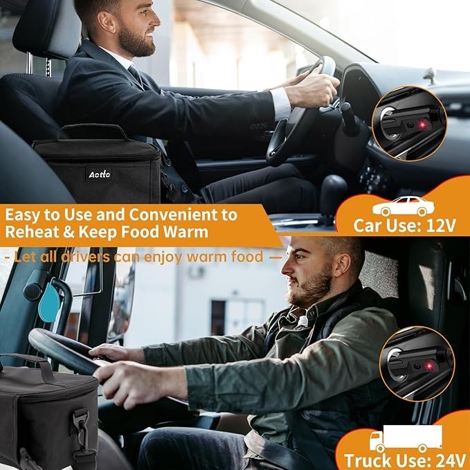 ✅ 12/24V CAR FOOD WARMER (W/VEHICLE PLUG): Easy to enjoy hot and healthy food on the road. Aotto food warmer for car is ideal for reheating or cooking healthy dishes while driving, whether you are a trucker driver, delivery person, or traveler and more. You can use it on any vehicle with a 12 volt or 24 volt lighter port like a car, truck etc ✅ PERFECTLY REHEATED FOOD: No need to keep checking on the food. The automatic temperature control will heat and cook leftovers, prepackaged, fresh, or refrigerated meals evenly and without drying out. A car microwave can hold the temperature for hours without producing a bad odor, and retain the moisture and flavor of the food ✅ STRESS-FREE COOKING: Just put a meal in the portable oven, plug it in your car with a 12V lighter port or truck with a 24V lighter port, go about your daily work or play, and enjoy your meal when you are ready for it, whether an hour or hours later, your food will be reheated or cooked to be moist and juicy ✅ NO COMPATIBILITY WORRIES: This car lunch box warmer is compatible with various flat bottom and heatable containers like Glass, Plastic, Aluminum Foil, Stainless Steel, Cardboard and more. The large capacity portable food warmer for car can accommodate containers size up to 9.76" L x 7.01" W x 3.94" H ✅ PORTABLE AND CONVENIENT: Designed with a carrying handle and an adjustable & detachable shoulder strap, foldable soft sides for easy storage. A portable travel microwave for car that you can put in your backpack and carry it to any place. No more waiting in line or eating cold food. Easy to make your meals without screwing up ✅ PREMIUM COMPONENTS: Heating pad with a power cord for vehicle use (car plug for 12V & 24V use), insulated carry bag and shoulder strap
