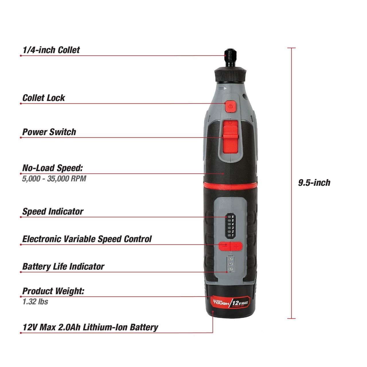 12V Max Cordless Rotary Tool is perfect for detailed work, offering versatility with its 40-piece accessory kit. Powered by a 12V 2.0Ah lithium-ion battery, it delivers variable speeds from 5,000 to 35,000 RPM with a max setting for more demanding tasks. The tool features a battery capacity indicator and LED speed controls, allowing easy adjustments via Add & Subtract buttons. Weighing just 1.32 lbs, it’s lightweight and comfortable to use for extended periods. The kit also includes a charger, making it ideal for any project requiring precision and control. 12V Max Cordless Rotary Tool with 40-Piece Accessory Kit Includes 12V 2.0Ah Lithium-Ion Battery and Charger Variable speeds (6 + MAX setting) Battery capacity indicator LED indicator for variable speed via Add & Subtract button