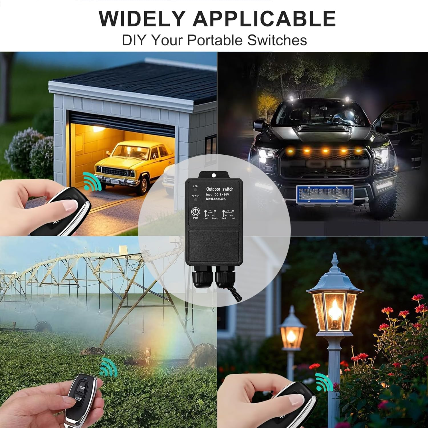 【Wide Voltage Compatibility & High-Power Load】Supports DC 8V–80V wide voltage, equipped with 30A heavy-duty relay. Capable of driving high-power devices such as water pumps, motors, dust collectors, fans, lighting systems, and outdoor electrical appliances with long-term stable performance. 【Stable RF Signal, Long Remote Distance】Adopts advanced 433MHz RF technology with high reception sensitivity. The strong and stable signal can pass through walls, floors, ceilings, and doors, achieving a reliable remote range of 328 ft in open spaces. 【IP67 Waterproof Structure for Outdoor Use】Designed with a fully sealed waterproof housing. Prevent dust and water intrusion, making it ideal for outdoor, humid, and harsh environments such as gardens, patios, farms, workshops, and weather-exposed installations. 【Premium Material & Safety Protection】The relay switch uses high-strength, high-temperature-resistant shell material, which is flame-retardant, wear-resistant, and electrically insulated. Ensures safe operation even under continuous load. Anti-interference wireless coding provides stable control and prevents unintended triggers. 【Easy Installation & Wide Applications】Simply connect the receiver between the power supply and the device to complete installation. Supports ON/OFF control for lights, water pumps, ventilation fans, motors, alarms, transformers, car accessories, spray pumps, bar lighting effects, security systems, DIY projects, and more. Product description