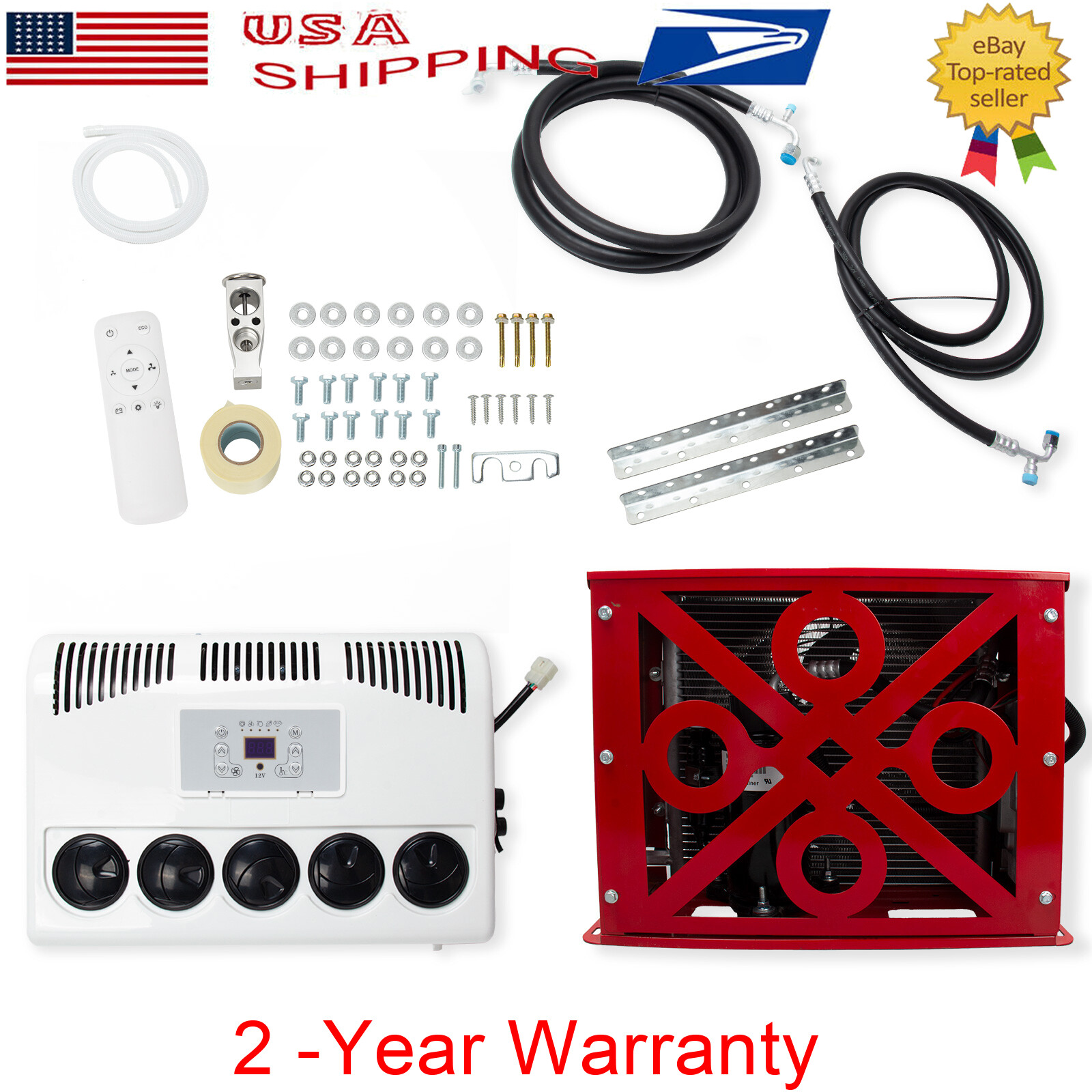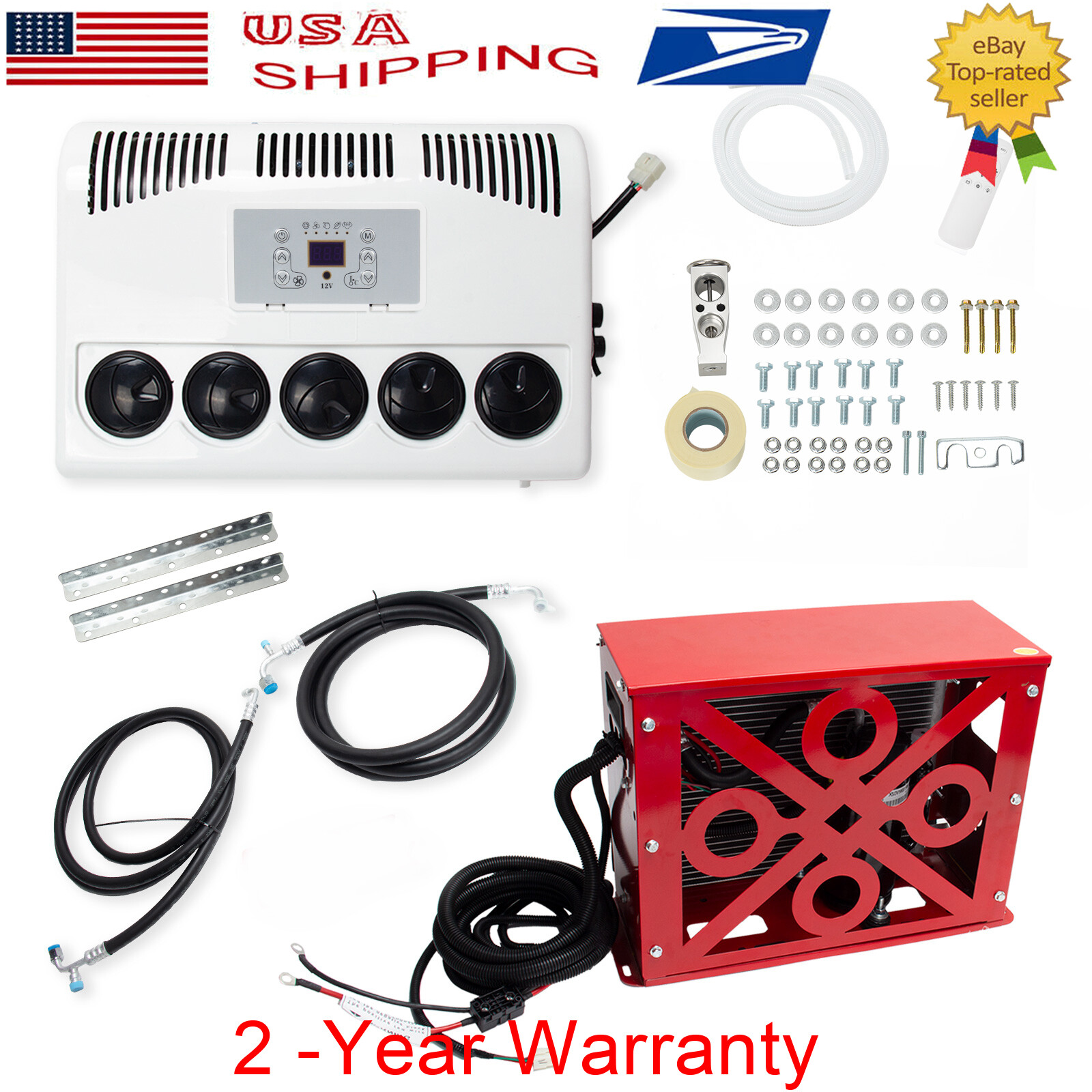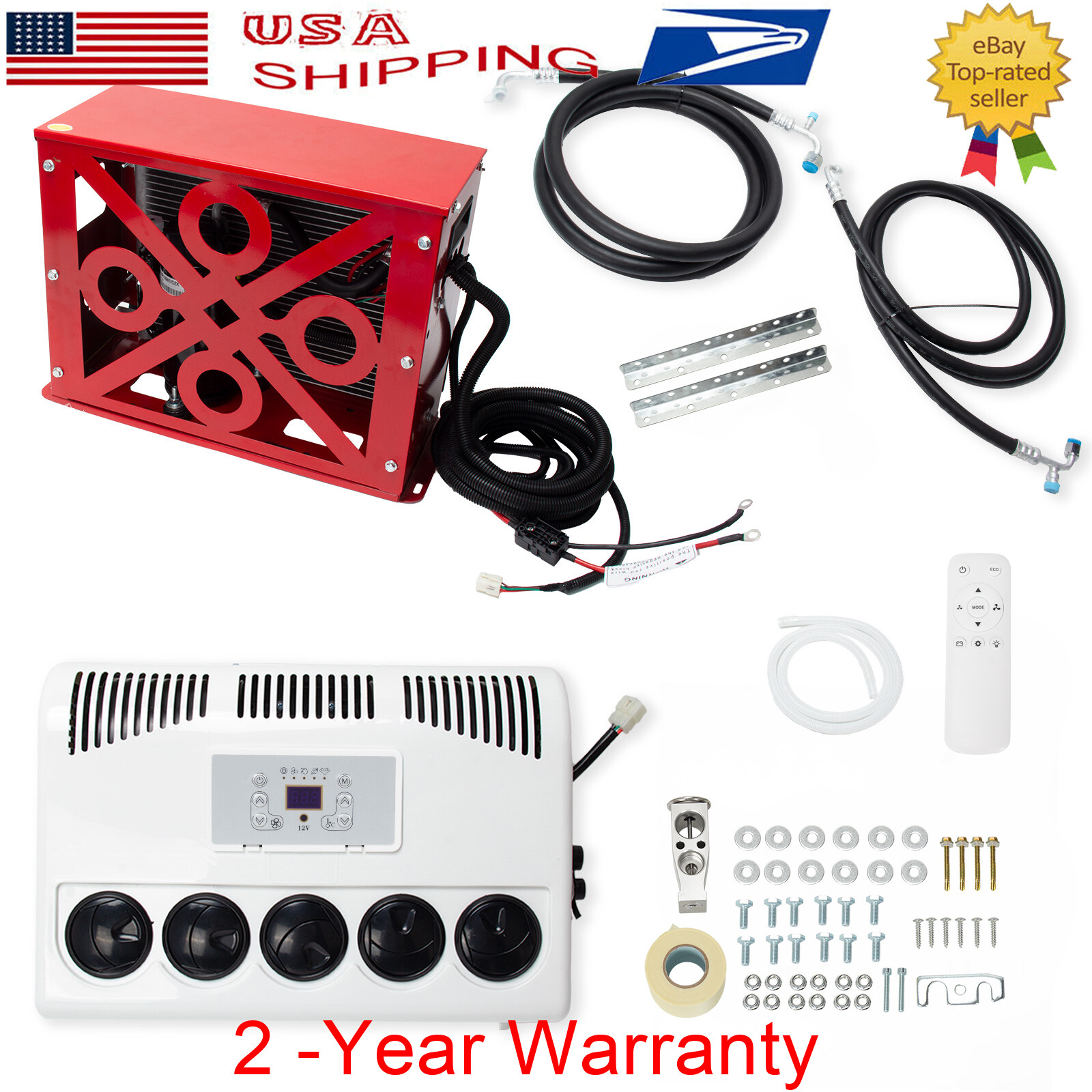 DC 12V Electric Air Conditioner Split AC Kit For Semi Trucks Bus RV Caravan Vans Red Outdoor unit can be under mounted horizonlly FLAT - This electric air conditioner is operated by a battery (generator). You can still use the air conditioner even when the engine is off. Low noise, energy saving and environmental protection is your best choice. Save thousands of dollars in fuel bills each year. Energy saving, economical, environmental protection, no pollution - Air conditioning parameters: Voltage: 12V. Startup current needs 75A. Power: 850W. Cooling capacity: 11000BTU. Add R134a/600g. The outdoor unit can be installed vertically behind the front of the car, or can be installed horizontally on the roof. - The parking air conditioner runs when the engine is off to cool the cabin, which will protect your engine from idling. Instead of consuming fuel, it can be powered by a battery or generator. 12V DC compressors are safer and quieter than high voltage compressors that run with inverters. Inverter air conditioners will monitor battery conditions and operate accordingly, reducing energy consumption. - DC Power: The DC electric air conditioner uses a high-efficiency electric scroll compressor and is powered by the vehicle battery. It keeps your cab cool even when the engine is off. - Suitable for trucks, RVs, vans, excavators, passenger cars, agricultural vehicles, engineering vehicles, ships, etc. - To give drivers plenty of rest and increase safety on the road, our powerful air conditioning system ensures pleasant temperature and humidity and creates an ideal climate for electric parking cooler systems for trucks, buses, vans, motorhomes. High-quality components set high-quality standards for parking coolers and ensure a long service life with minimal maintenance. Electric parking cooler reduces engine idle time, saving fuel. Low pressure cutoff ensures engine start. ATTENTION: 600 g R134A is required to be CHARGED into the air conditioner machine ,if you think 600 g is not enough and want to make the machine make more cooler air,you may charge more R134A ,and the max is 750 g. SIZE OF OUTDOOR UNIT:L:520 * W:420 * H:210 (mm) / L:20.5 X W:16.5 X H:8.25 - inches,48 lb SIZE OF INDDOR UNIT:L:430 * W:320 * H:190 (mm) / L:16.9 X W:12.5 X H:7.5 - inches, 12 lb Features: 1. Thick aluminum condenser, anti-corrosion aluminum, good ventilation and heat dissipation, fast flow rate and fast cooling 2. Stainless steel shell, corrosion-resistant, no deformation 3. Save fuel and electricity 4. Remote one-button control 5. Intelligent frequency conversion 6. Super large air volume, silent air, 360 degree air supply, three gear options 7. Large air outlet 8. High-quality screw fittings, fine workmanship 9. Automatic transmission, rapid cooling, long standby time 10. Automatically adjust the temperature according to room temperature Specification: Powered by the battery of the Truck car. 1. Color: red 2. Rated power: 300-850w 3. Rated current: 40-70A 4. Undervoltage protection: 11.4 5. Protection level: IP * 4 6. Freezing medium: R134a 7. Voltage: DC 12V 8. Air volume: 500m³ / h 9. Cooling capacity: 11000 BTU 10. Undervoltage response: 10.6-11.4v 11. Control method: remote control 12. refrigerant-capacity: 600g-750g ( R134A ) 13.battery cables:7 awg (if the cables are too short for you,you can buy a 100A anderson connector and extra two 7awg cables to make it longer enough) 14. Applicable models: heavy trucks, light trucks, construction vehicles, excavators, ships, touring vehicles, refrigerated vehicles, etc. 15.suggest battery:12v/150a or better Package Includes: 1 Set Air Conditioner