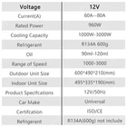 1 2V: Current (A):60A-80A Rated power:960W Cooling capacity:1000W-3000W Refrigerant:R134A 600g (Not include in the package) Oil:90ml-120ml POE68 Circulating air volume: 600m³/H Range of Speed:1000-3000 Outdoor unit size:660*490*210 (mm) Indoor unit size:495*355*190 (mm) Package inclu ding: 1*Air C ondit ioner Kit (Outdoor unit and Indoor Unit)