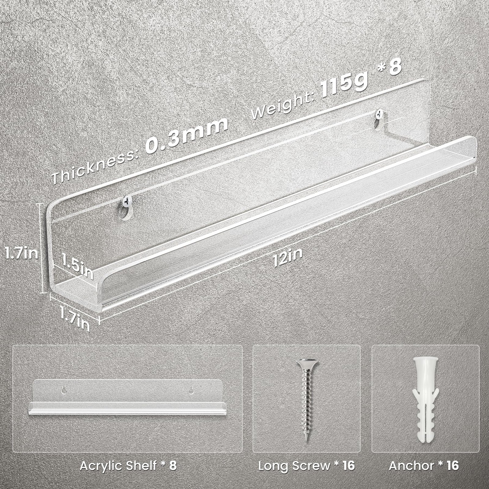 8 Pack Vinyl Record Shelf Wall Mount, 12 inch Album Record Holder Display, Clear Acrylic Floating Shelves for Wall, Suitable for Bedroom, Living Room, Magazine Shelf, Kids Bookshelf, etc Premium Clear Record Shelf: Clear acrylic vinyl wall mount Designed to showcase your favorite vinyl records, record holder enables you to well display your vinyl records without obscuring artwork or labels. Record Collector's: Ideal for music enthusiasts to proudly exhibit rare pressings, favorite albums, or limited editions. vinyl shelf Transform hidden collections into striking wall art. Create your private collection space and add an artistic touch to your room. Multi-Functional Floating Shelf: Acrylic shelves Beyond vinyl records: Display books, perfumes, collectibles, photo frames, basketball cards, comic books, nail polish, figurines, or decorative items. Transparent construction complements any interior style from modern to eclectic. Sturdy and Easy to Install: Made of acrylic material, the vinyl record holder is very which can bear max 2.5KG.Vinyl record wall mount Includes complete mounting hardware for quick installation - ready to use in minutes(Size: 12x1.7x1.7 inch) Notice: The acrylic suspension rack is affixed with a protective film to prevent scratches, which will make the record rack look opaque and cloudy. So please tear off the protective film before use to ensure the clarity of the record rack. Clear acrylic vinyl wall mount Designed to showcase your favorite vinyl records, record holder enables you to well display your vinyl records without obscuring artwork or labels. Shipping We offer FREE shipping on all orders! We ship within Three business days of payment, usually sooner. We use a selection of shipping services such as UPS, FedEx, USPS etc. We only ship to the lower 48 states, no APO/FPO addresses or PO Boxes allowed. Local pickups and combined shipping options are not provided at this time. Return You can return a product for up to 30 days from the date you purchased it. Any product you return must be in the same condition you received it and in the original packaging. Please keep the receipt. Payment We accept payment by any of the following methods: PayPal Please pay as soon as possible after winning an auction, as that will allow us to post your item to you sooner! Feedback Customer satisfaction is very important to us. If you have any problem with your order, please contact us and we will do our best to make you satisfied. Contact Us If you have any queries, please contact us via ebay. We usually respond within 24 hours on weekdays. Please visit our eBay store to check out other items for sale! Thank you for shopping at our store.