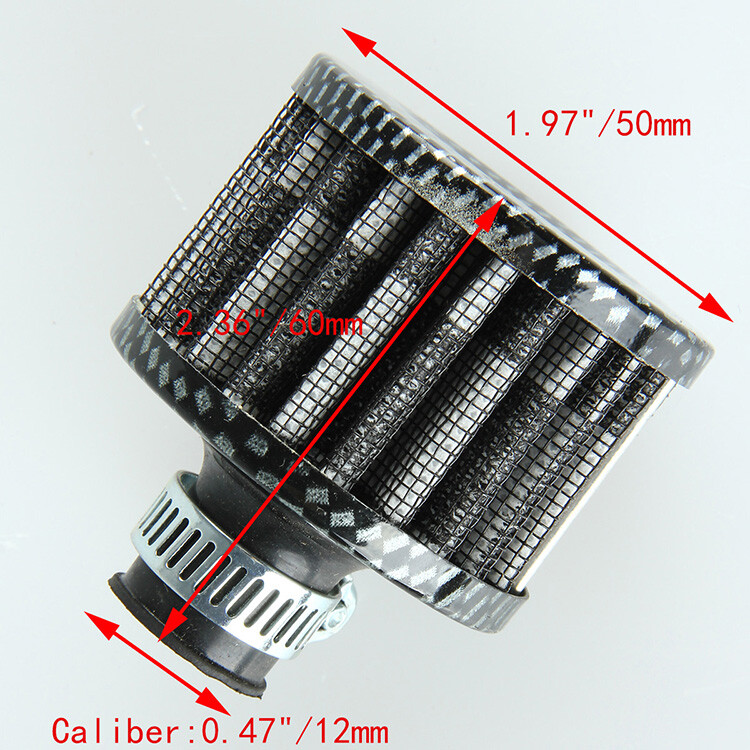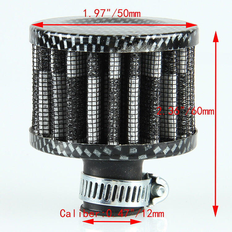 Feature: Directly bolt-on with no modification require. Fine mesh increases and strengthen the amount of air flow. It clamps directly to any intake vacuum applications,Tightened by the Stainless Steel Clamp provided Great quality mini filter in carbon fiber look for customizing your ride and replace your filter element now. Specification: Brand new Material: Aluminum Color: Imitation Carbon Fiber Look Style Inlet Diameter: 12mm Size:6.0 x 5.0 cm/2.36 x 1.97 inch(H x D) Fitment: Universal fitment for any 0.47" 12mm intake system. Package Included: 1 x Air Filter