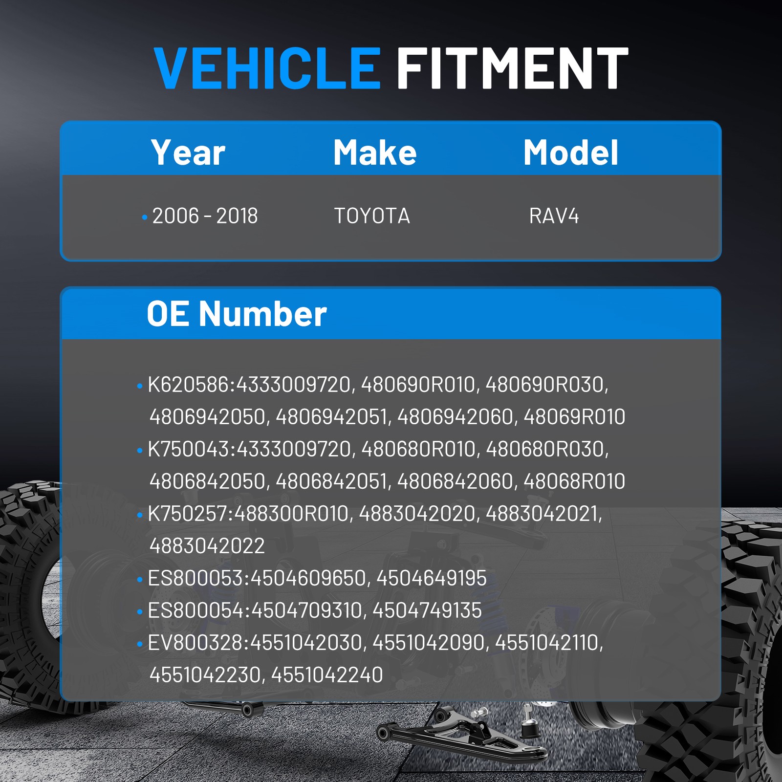 Package Includes: 1x Front Right Upper Control Arm + Ball Joint - K620616 1x Front Left Upper Control Arm + Ball Joint - K620617 1x Front Lower Right Control Arm - K640289 1x Front Lower Left Control Arm - K640290 2x Front Lower Ball Joints - K80228 2x Front Inner Tie Rod Ends - EV80210 1x Front Left Outer Tie Rod End - ES80288 1x Front Right Outer Tie Rod End - ES80287 1x Front Left Sway Bar End Link - K90456 1x Front Right Sway Bar End Link - K90457 1x Rear Right Sway Bar End Link - K90342 1x Rear Left Sway Bar End Link - K90343 2x Tie Rod Boots + Bellows w/Locking C-Clamps For the following Vehicles: 2006 - 2018 TOYOTA RAV4 All Models Specifications: 1. Placement on Vehicle: Front, Left, Lower, Rear, Right, Inner, Outer 2.OE/Part number: K620586:4333009720, 480690R010, 480690R030, 4806942050, 4806942051, 4806942060, 48069R010 K750043:4333009720, 480680R010, 480680R030, 4806842050, 4806842051, 4806842060, 48068R010 K750257:488300R010, 4883042020, 4883042021, 4883042022 ES800053:4504609650, 4504649195 ES800054:4504709310, 4504749135 EV800328:4551042030, 4551042090, 4551042110, 4551042230, 4551042240 Package Includes: 1x Front Right Upper Control Arm + Ball Joint - K620616 1x Front Left Upper Control Arm + Ball Joint - K620617 1x Front Lower Right Control Arm - K640289 1x Front Lower Left Control Arm - K640290 2x Front Lower Ball Joints - K80228 2x Front Inner Tie Rod Ends - EV80210 1x Front Left Outer Tie Rod End - ES80288 1x Front Right Outer Tie Rod End - ES80287 1x Front Left Sway Bar End Link - K90456 1x Front Right Sway Bar End Link - K90457 1x Rear Right Sway Bar End Link - K90342 1x Rear Left Sway Bar End Link - K90343 2x Tie Rod Boots + Bellows w/Locking C-Clamps For the following Vehicles: 2006 - 2018 TOYOTA RAV4 All Models