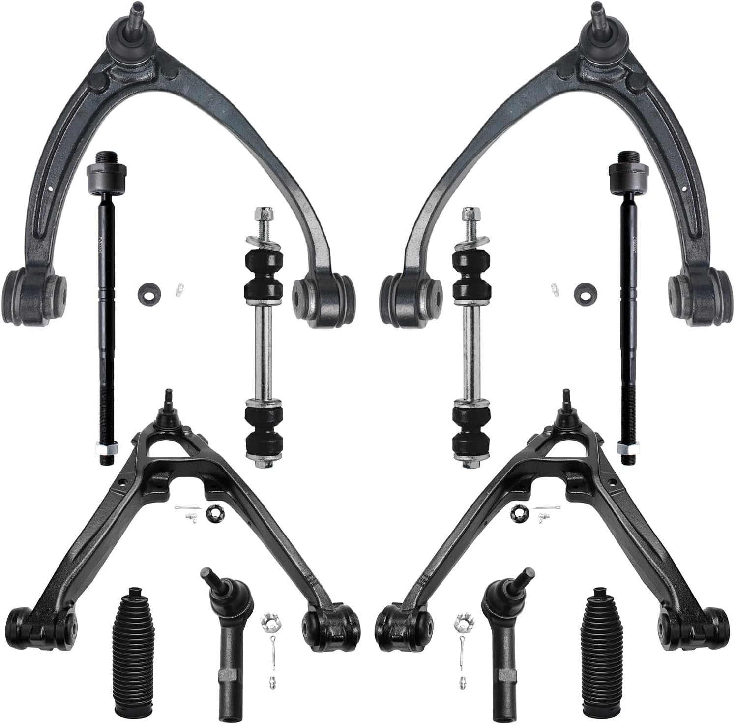 Note : what you get : choose 1 : 2x control arm 1x Front Upper Left Control Arm w/ Ball Joint Assembly - K80669 1x Front Upper Right Control Arm w/ Ball Joint Assembly - K80670 choose 2: 6x Control Arms+TieRod 1x Front Upper Left Control Arm w/ Ball Joint Assembly - K80669 1x Front Upper Right Control Arm w/ Ball Joint Assembly - K80670 2x Front Driver & Passenger Side Inner Tie Rod End - EV800084 2x Front Driver & Passenger Side Outer Tie Rod End - ES800223 choose 3: 4x Control Arms+Ball Joints 1x Front Upper Left Control Arm w/ Ball Joint - K80669 1x Front Upper Right Control Arm w/ Ball Joint - K80670 2x Front Lower Ball Joints - K6541 **Lower Ball Joints Fit STEEL Control Arms ONLY** choose 4: 12x Control Arms+TieRod+BallJoints 1x Front Upper Left Control Arm w/ Ball Joint Assembly - K80669 1x Front Upper Right Control Arm w/ Ball Joint Assembly - K80670 2x Front Sway Bar Stabilizer Link - K700432 2x Front Lower Ball Joints - K6541 2x Front Inner Tie Rod Ends - EV800084 2x Front Outer Tie Rod Ends - ES800223 2x Rack and Pinion Boots & Bellows ** Lower Ball Joints Fit Steel Control Arms ** MAKE MODEL YEAR RANGE SPECIFIC DETAILS CADILLAC ESCALADE 2007 - 2009 Lower Ball Joints Fit Steel Control Arms CADILLAC ESCALADE 2010 - 2013 6.2L V8; Lower Ball Joints Fit Steel Control Arms CADILLAC ESCALADE 2014 Lower Ball Joints Fit Steel Control Arms CADILLAC ESCALADE ESV 2007 - 2014 Lower Ball Joints Fit Steel Control Arms CADILLAC ESCALADE EXT 2007 - 2013 Lower Ball Joints Fit Steel Control Arms CHEVROLET AVALANCHE 2007 - 2013 Lower Ball Joints Fit Steel Control Arms CHEVROLET SILVERADO 1500 2007 - 2013 Lower Ball Joints Fit Steel Control Arms CHEVROLET SUBURBAN 1500 2007 Lower Ball Joints Fit Steel Control Arms CHEVROLET SUBURBAN 1500 2008 All Models CHEVROLET SUBURBAN 1500 2009 - 2014 Lower Ball Joints Fit Steel Control Arms CHEVROLET TAHOE 2007 - 2014 Lower Ball Joints Fit Steel Control Arms GMC SIERRA 1500 2007 - 2013 Lower Ball Joints Fit Steel Control Arms GMC YUKON 2007 - 2013 Lower Ball Joints Fit Steel Control Arms GMC YUKON XL 1500 2007 - 2008 All Models GMC YUKON XL 1500 2009 - 2013 Lower Ball Joints Fit Steel Control Arms