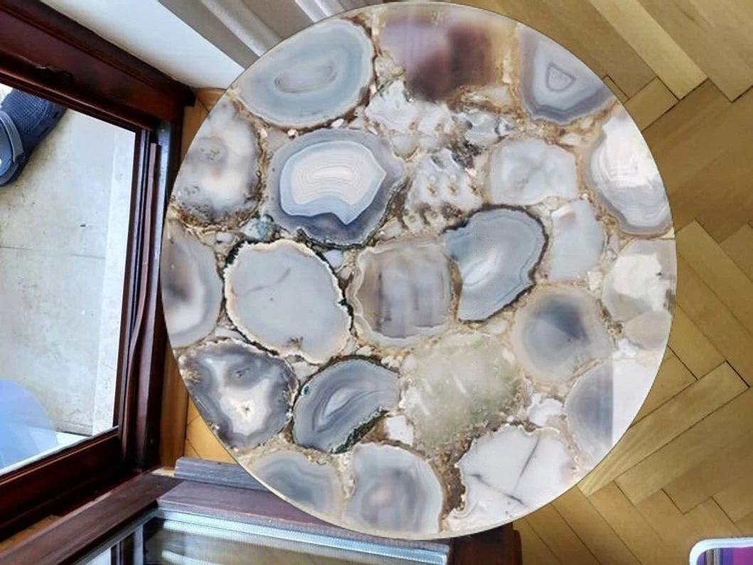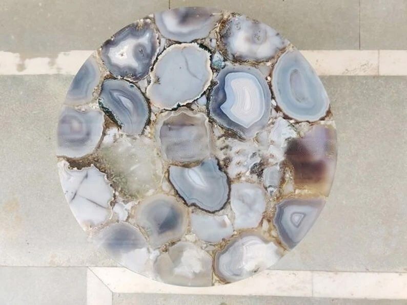 Welcome To Stone-Craft- Creations Shop Description Very unique Art by Indian Artist ,Coffee/Side Table top Used Material: Natural Agate Stones Arts Size: 12"x12" Inches Color: As Photo Shape: Round Pattern: Handmade Room: Bedroom, Dining Room, Hallway, Home Office/Study, Kid’s Bedroom, Kitchen, Laundry/Utility Room, Living Room,Patio, Playroom Packaging: Wood & Foam Export Packing Shipping: Air Can Be customize ,Please Message us your desired Size 1. It can be used as a Dining Table, Guest table, coffee table, center table top in show room as well as a gift for your loved ones. 2. The table top is made in Agra India & fully handmade. 3. The top will be delivered by FedEx or DHL free of cost door to door. 4. If there is any local tax,custom duties or Vat will be paid by the buyer at the destination. 5. The parcel is dispatch with proper packing & fully insured covering all kind of risk. 6. To maintain the table top is simple soap & water & dry cotton cloth. 7. If You Are Looking Something Customize, Let Us Know We Will Make For You As Per Your Design, Size & Shape. 8.Table top does not includes any wooden, marble stand or base if you like to buy marble or wooden base or stand that will be charged extra. Marble Agate Table Tops We are Manufacturer & Exporter of marble agate table tops. These marble agate table tops have different shapes like Round Table top, Octagonal Table Tops, Rectangle / Dining table tops, Square Table tops, Chess Table tops, Taj Mahal Table tops, Custom Designs Table tops also make marble Table top Base and Stand. Then we can be used as dining tables, coffee tables, Center tables, conference tables, chess boards, reading tables, bar tables , Garden table, side and corner tables or any other use as per the indoor and outdoor decor. They can also be placed outdoors in the garden, as marble is stain free, offers great resistance to the forces of nature, and can withstand heavy temperatures. We also meet customized requirement and offer our marble table tops at industry leading prices. About Agate Stone- Agate is a rock consisting primarily of cryptocrystalline silica, chiefly chalcedony, alternating with microgranular quartz. It is characterized by its fineness of grain and variety of color. Although agates may be found in various kinds of host rock, they are classically associated with volcanic rocks and can be common in certain metamorphic rocks. Ancient use of agate stone Agate is one of the most common materials used in the art of hardstone carving, and has been recovered at a number of ancient sites, indicating its widespread use in the ancient world; for example, archaeological recovery at the Knossos site on Crete illustrates its role in Bronze Age Minoan culture Types Of Agate 1. Fortification Agate This is the most common and distinctive type of agate. In these agates, bands crystallized into concentric layers that more or less follow the shape of the cavity. The banding resembles an aerial view of a fort 2. Water-Line Agate (also called water-level or onyx) During its formation, silica-rich solution either entered the cavity slowly laying one band at a time, excess water drained out leaving a small amount of silica to settle out into separate bands, or the vesicle filled under low pressure. In any case, the silica crystallization in water-level agates is controlled by gravity in one orientation, forming a stack up of parallel bands. 3. Shadow Agate Some agates exhibit a shadow effect in which there is what appears to be movement across the agate layers when the specimen is rocked back and forth (or your orientation to the specimen moves). This optical effect only occurs when there are alternating translucent and opaque bands. It is caused when light goes into the agate, but is not reflected out. 4. Tube Agate Tube Agate During the formation of some agates, parallel projections of tiny hair-thin mineral rods grow first within the silica gel, around which later the chalcedony agate micro-crystals form. In some cases the inclusions remain, but sometimes they weather away leaving hollow tubes that subsequently fill in with silica. 5. Eye Agates This mysterious agate characteristic is believed to be formed when most of the silica gel drains from the cavity, leaving only a droplet that “beads up” on the inside wall of the cavity. This droplet crystallizes into solid chalcedony “eyes”. In some cases, crystal growth will continue from this droplet in a manner similar to the formation of stalactites in caves. Later, the pocket fills in with the usual deposition of chalcedony microcrystals. 6. Plume Agate These agates initially had formations on their outside layer that formed prior to the deposition of chalcedony bands. They are filament growths of mineral inclusions that resemble ferns or feathers. 7. Geode Agate Geode Agate In some cases the supply of silica-rich water runs out before the entire cavity fills in. When there is a hollow center within a crystalline outer fill, the specimen is considered a geode. Not all geodes have agate banding, but many do. Also, the inner layers can form into several different types of silica mineral crystals and may even have other types of mineral crystals. 8. Moss Agate Moss Agate Moss agates have clusters of mineral inclusions that resemble plants, trees, or landscapes. Most moss agate inclusions are comprised of iron or manganese oxide. In some cases, the inclusions inhibit chalcedony banding allowing the mineral clusters free reign to grow within the silica gel. 9. Seam Agate Seam agates for in cracks within host rock, rather than in rounder pockets. The bands form in parallel rows that follow and fill in the crack or seam.
