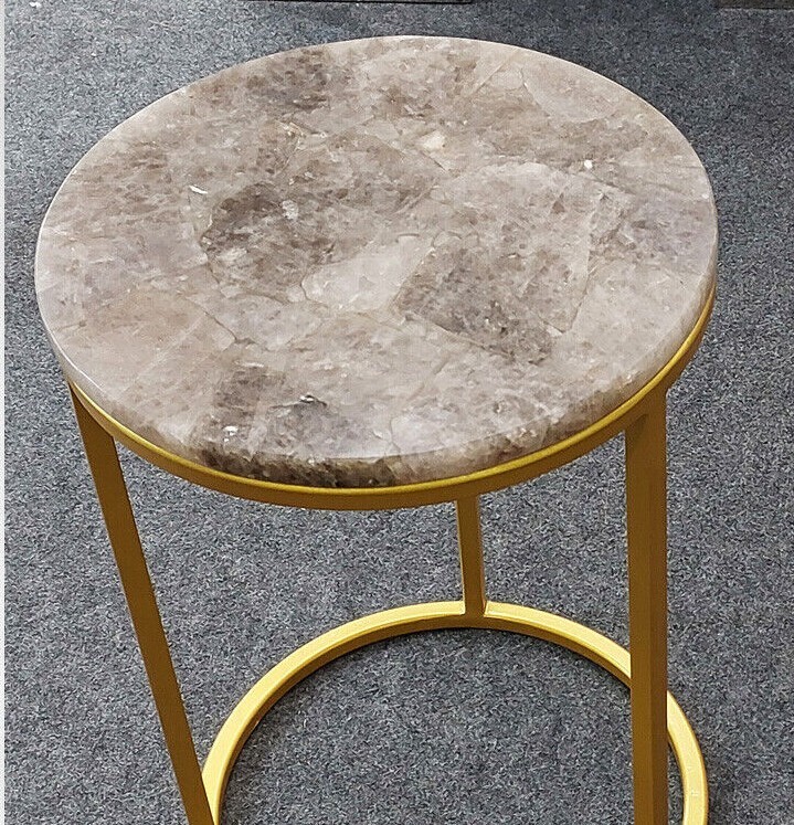 Welcome To Stone-Craft- Creations Shop Description Very unique Art by Indian Artist ,Coffee/Side Table top Used Material: Natural Smokey Quartz Stones Arts Size: 12"x 12" Inches Color: As Photo Shape: Round Pattern: Handmade Room: Bedroom, Dining Room, Hallway, Home Office/Study, Kid’s Bedroom, Kitchen, Laundry/Utility Room, Living Room,Patio, Playroom Packaging: Wood & Foam Export Packing Shipping: Air Can Be customize ,Please Message us your desired Size 1. It can be used as a Dining Table, Guest table, coffee table, center table top in show room as well as a gift for your loved ones. 2. The table top is made in Agra India & fully handmade. 3. The top will be delivered by FedEx or DHL free of cost door to door. 4. If there is any local tax,custom duties or Vat will be paid by the buyer at the destination. 5. The parcel is dispatch with proper packing & fully insured covering all kind of risk. 6. To maintain the table top is simple soap & water & dry cotton cloth. 7. If You Are Looking Something Customize, Let Us Know We Will Make For You As Per Your Design, Size & Shape. 8.Table top does not includes any wooden, marble stand or base if you like to buy marble or wooden base or stand that will be charged extra. Marble Agate Table Tops We are Manufacturer & Exporter of marble agate table tops. These marble agate table tops have different shapes like Round Table top, Octagonal Table Tops, Rectangle / Dining table tops, Square Table tops, Chess Table tops, Taj Mahal Table tops, Custom Designs Table tops also make marble Table top Base and Stand. Then we can be used as dining tables, coffee tables, Center tables, conference tables, chess boards, reading tables, bar tables , Garden table, side and corner tables or any other use as per the indoor and outdoor decor. They can also be placed outdoors in the garden, as marble is stain free, offers great resistance to the forces of nature, and can withstand heavy temperatures. We also meet customized requirement and offer our marble table tops at industry leading prices. About Agate Stone- Agate is a rock consisting primarily of cryptocrystalline silica, chiefly chalcedony, alternating with microgranular quartz. It is characterized by its fineness of grain and variety of color. Although agates may be found in various kinds of host rock, they are classically associated with volcanic rocks and can be common in certain metamorphic rocks. Ancient use of agate stone Agate is one of the most common materials used in the art of hardstone carving, and has been recovered at a number of ancient sites, indicating its widespread use in the ancient world; for example, archaeological recovery at the Knossos site on Crete illustrates its role in Bronze Age Minoan culture Types Of Agate 1. Fortification Agate This is the most common and distinctive type of agate. In these agates, bands crystallized into concentric layers that more or less follow the shape of the cavity. The banding resembles an aerial view of a fort 2. Water-Line Agate (also called water-level or onyx) During its formation, silica-rich solution either entered the cavity slowly laying one band at a time, excess water drained out leaving a small amount of silica to settle out into separate bands, or the vesicle filled under low pressure. In any case, the silica crystallization in water-level agates is controlled by gravity in one orientation, forming a stack up of parallel bands. 3. Shadow Agate Some agates exhibit a shadow effect in which there is what appears to be movement across the agate layers when the specimen is rocked back and forth (or your orientation to the specimen moves). This optical effect only occurs when there are alternating translucent and opaque bands. It is caused when light goes into the agate, but is not reflected out. 4. Tube Agate Tube Agate During the formation of some agates, parallel projections of tiny hair-thin mineral rods grow first within the silica gel, around which later the chalcedony agate micro-crystals form. In some cases the inclusions remain, but sometimes they weather away leaving hollow tubes that subsequently fill in with silica. 5. Eye Agates This mysterious agate characteristic is believed to be formed when most of the silica gel drains from the cavity, leaving only a droplet that “beads up” on the inside wall of the cavity. This droplet crystallizes into solid chalcedony “eyes”. In some cases, crystal growth will continue from this droplet in a manner similar to the formation of stalactites in caves. Later, the pocket fills in with the usual deposition of chalcedony microcrystals. 6. Plume Agate These agates initially had formations on their outside layer that formed prior to the deposition of chalcedony bands. They are filament growths of mineral inclusions that resemble ferns or feathers. 7. Geode Agate Geode Agate In some cases the supply of silica-rich water runs out before the entire cavity fills in. When there is a hollow center within a crystalline outer fill, the specimen is considered a geode. Not all geodes have agate banding, but many do. Also, the inner layers can form into several different types of silica mineral crystals and may even have other types of mineral crystals. 8. Moss Agate Moss Agate Moss agates have clusters of mineral inclusions that resemble plants, trees, or landscapes. Most moss agate inclusions are comprised of iron or manganese oxide. In some cases, the inclusions inhibit chalcedony banding allowing the mineral clusters free reign to grow within the silica gel. 9. Seam Agate Seam agates for in cracks within host rock, rather than in rounder pockets. The bands form in parallel rows that follow and fill in the crack or seam.