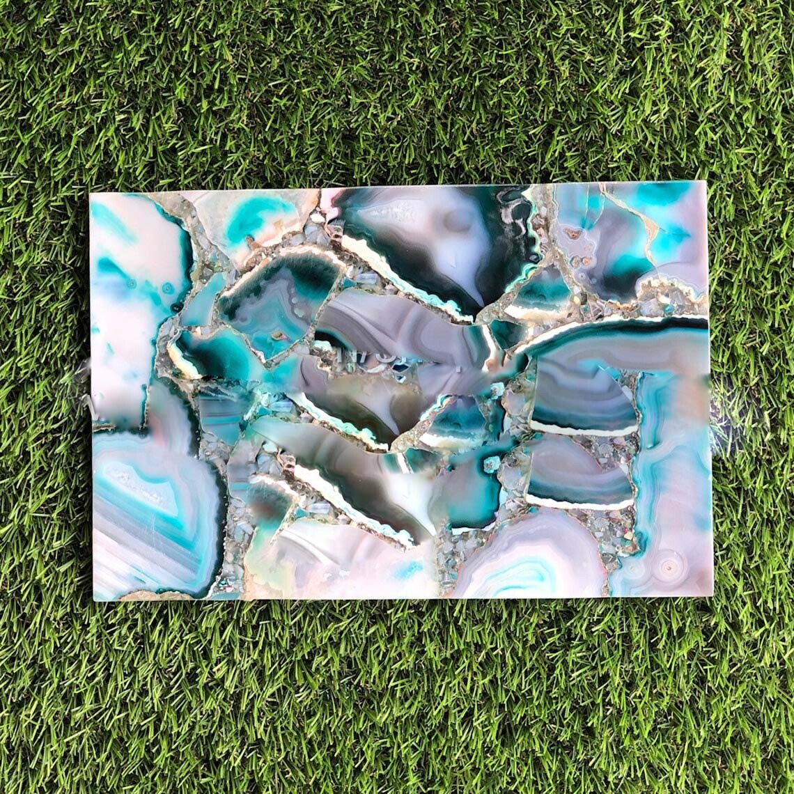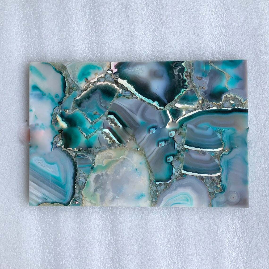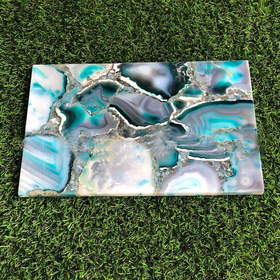 Welcome To Stone-Craft- Creations Shop Description Very unique Art by Indian Artist ,Coffee/Side Table top Used Material: Natural Stones Arts Size: 12"x 9" Inches Color: As Photo Shape: Rectangle Pattern: Handmade Room: Bedroom, Dining Room, Hallway, Home Office/Study, Kid’s Bedroom, Kitchen, Laundry/Utility Room, Living Room,Patio, Playroom Packaging: Wood & Foam Export Packing Shipping: Air Can Be customize ,Please Message us your desired Size 1. It can be used as a Dining Table, Guest table, coffee table, center table top in show room as well as a gift for your loved ones. 2. The table top is made in Agra India & fully handmade. 3. The top will be delivered by FedEx or DHL free of cost door to door. 4. If there is any local tax,custom duties or Vat will be paid by the buyer at the destination. 5. The parcel is dispatch with proper packing & fully insured covering all kind of risk. 6. To maintain the table top is simple soap & water & dry cotton cloth. 7. If You Are Looking Something Customize, Let Us Know We Will Make For You As Per Your Design, Size & Shape. 8.Table top does not includes any wooden, marble stand or base if you like to buy marble or wooden base or stand that will be charged extra. Marble Agate Table Tops We are Manufacturer & Exporter of marble agate table tops. These marble agate table tops have different shapes like Round Table top, Octagonal Table Tops, Rectangle / Dining table tops, Square Table tops, Chess Table tops, Taj Mahal Table tops, Custom Designs Table tops also make marble Table top Base and Stand. Then we can be used as dining tables, coffee tables, Center tables, conference tables, chess boards, reading tables, bar tables , Garden table, side and corner tables or any other use as per the indoor and outdoor decor. They can also be placed outdoors in the garden, as marble is stain free, offers great resistance to the forces of nature, and can withstand heavy temperatures. We also meet customized requirement and offer our marble table tops at industry leading prices. About Agate Stone- Agate is a rock consisting primarily of cryptocrystalline silica, chiefly chalcedony, alternating with microgranular quartz. It is characterized by its fineness of grain and variety of color. Although agates may be found in various kinds of host rock, they are classically associated with volcanic rocks and can be common in certain metamorphic rocks. Ancient use of agate stone Agate is one of the most common materials used in the art of hardstone carving, and has been recovered at a number of ancient sites, indicating its widespread use in the ancient world; for example, archaeological recovery at the Knossos site on Crete illustrates its role in Bronze Age Minoan culture Types Of Agate 1. Fortification Agate This is the most common and distinctive type of agate. In these agates, bands crystallized into concentric layers that more or less follow the shape of the cavity. The banding resembles an aerial view of a fort 2. Water-Line Agate (also called water-level or onyx) During its formation, silica-rich solution either entered the cavity slowly laying one band at a time, excess water drained out leaving a small amount of silica to settle out into separate bands, or the vesicle filled under low pressure. In any case, the silica crystallization in water-level agates is controlled by gravity in one orientation, forming a stack up of parallel bands. 3. Shadow Agate Some agates exhibit a shadow effect in which there is what appears to be movement across the agate layers when the specimen is rocked back and forth (or your orientation to the specimen moves). This optical effect only occurs when there are alternating translucent and opaque bands. It is caused when light goes into the agate, but is not reflected out. 4. Tube Agate Tube Agate During the formation of some agates, parallel projections of tiny hair-thin mineral rods grow first within the silica gel, around which later the chalcedony agate micro-crystals form. In some cases the inclusions remain, but sometimes they weather away leaving hollow tubes that subsequently fill in with silica. 5. Eye Agates This mysterious agate characteristic is believed to be formed when most of the silica gel drains from the cavity, leaving only a droplet that “beads up” on the inside wall of the cavity. This droplet crystallizes into solid chalcedony “eyes”. In some cases, crystal growth will continue from this droplet in a manner similar to the formation of stalactites in caves. Later, the pocket fills in with the usual deposition of chalcedony microcrystals. 6. Plume Agate These agates initially had formations on their outside layer that formed prior to the deposition of chalcedony bands. They are filament growths of mineral inclusions that resemble ferns or feathers. 7. Geode Agate Geode Agate In some cases the supply of silica-rich water runs out before the entire cavity fills in. When there is a hollow center within a crystalline outer fill, the specimen is considered a geode. Not all geodes have agate banding, but many do. Also, the inner layers can form into several different types of silica mineral crystals and may even have other types of mineral crystals. 8. Moss Agate Moss Agate Moss agates have clusters of mineral inclusions that resemble plants, trees, or landscapes. Most moss agate inclusions are comprised of iron or manganese oxide. In some cases, the inclusions inhibit chalcedony banding allowing the mineral clusters free reign to grow within the silica gel. 9. Seam Agate Seam agates for in cracks within host rock, rather than in rounder pockets. The bands form in parallel rows that follow and fill in the crack or seam.
