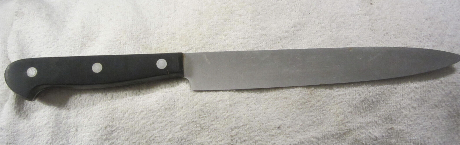 This Zwilling Henckels 13" kitchen knife is a fantastic vintage find! Despite some minor wear and small handle cracks, it's still solid and performs like a champ. The blade is sharp and durable, showing the quality craftsmanship of German knives. Photos accurately show its condition, and the seller ships efficiently. A great buy for collectors or anyone who appreciates reliable, well-made cutlery with a bit of history. Perfect if you love high-quality vintage knives that stand the test of time!