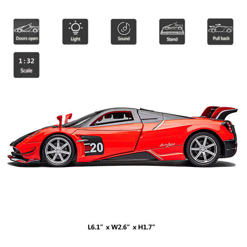 Item Type Diecast & Toy Vehicles Scale 1:32 Material Diecast and ABS Colour Red, as picture shows Dimension About L6.1" x W2.6" x H1.7" (L15.5 x W6.6 x H4.2 cm) Vehicle Type Supercar Function *Pull back *Open the door, it will make sound and light *Press the button on the car, two doors can be open *The stand is a mobile phone support, also you can put pens and bussiness card with the stand Power 3 x AG13/LR44 button cell, power is just for light and sound Packing Packing in bubble wrap, without color box Tips *Great choice of gift for kids, especially for Birthday, Christmas and New Year Gift *Great item for collector, business gift, home decoration, office decoration Warning Don't put in mouth/Keep Away from Fire/Not for Children under 3 Years Package include 1 x 1:32 Scale Pagani Huayra BC Model Car (Without box Batteries Included)