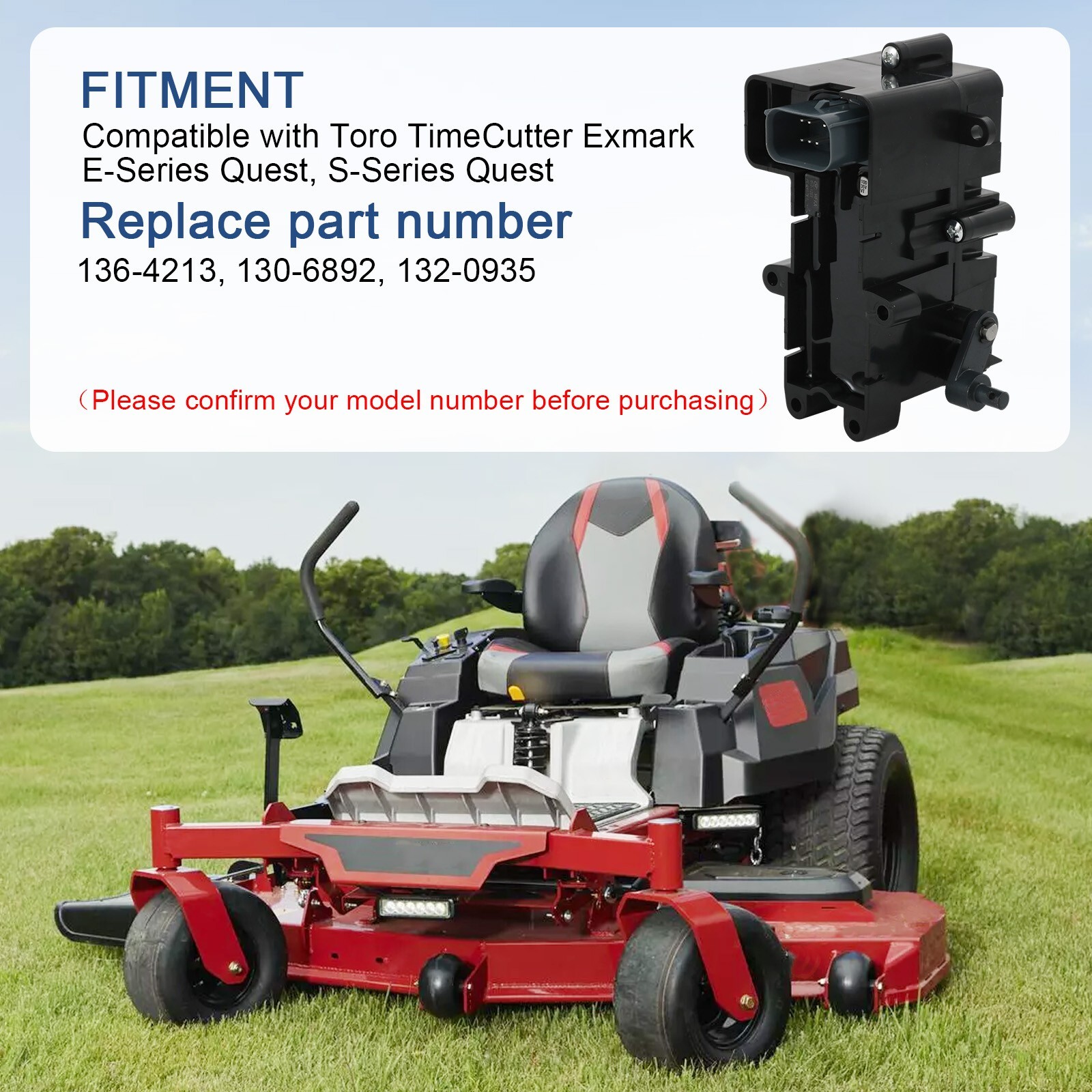 BRAKE CONTROLLER NEW 130-6892, 132-0935 FOR TORO TIMECUTTER 136-4213 ★ 1 Year warranty, long durable life ★ Fast and Free Ecomomic/Standard shipping Manufacturer: JDMSPEED Application: USED ON THE FOLLOWING MODELS 74650 74655 74656 74657 74660 74661 74710 74720 74721 74722 74723 74730 74731 74732 74740 74741 74750 74760 74770 74775 QTE452CEM42100 QTE452CEM42200 QTE708GEM42100 QTE708GEM50200 QTE708GEM54100 QTS452CEM34200 QTS708GEM42200 QTS708GEM50200 QTS725CKC42200 QTS725GKC50200 PART # 136-4213 REPLACES # 132-0935 REPLACES # 130-6892 PS: Ship items within one working days All parts are in stock and ready to ship The part you see is the part you receive Standard size, perfect match for your vehicle All parts are fully inspected and professionally packaged We respond to any and all buyer questions or issues Shipping and Payment Return Warranty Delivery Warning Shipping and Payment We ship all the packages within 1-2 business days. Our shipment arrive your address will take around 2-10 business days. Orders placed on Saturday or Sundays should be processed and shipped on Monday. Hope you can understand. If you didn't received packages in 15 business days, please contact us freely, and we will check and solve it. Please purchase and pay for the item through eBay auction, and do not manually send us a PayPal payment. Return 60-day money back guarantee We offer a 6-month warranty for most of our products that starts on the original purchase date. If you are not satisfied with our product, most items can be returned in their new/original/unworn condition within 60 days. We will offer a refund or exchange (Shipping and handling fees are not refundable). A 15% restocking fee ($10 minimum) may be applicable. Items that have been worn, misused, abused, damaged, and/or altered beyond warranty coverage and period will not be refunded or exchanged. Warranty This item have 1-year warranty. In the event the item should fail due to manufacturing defects during intended use, we will replace the part by free. We only warranty cost of item parts. Any installation or other fees are non-refundable. Note: Any modifying the item of any kind without contacting us will void any and all warranty coverage for this item. Please contact us before modifying the part so that we have the opportunity to correct the situation. You can contact us by ebay message to get the full text of the written warranty. Delivery We ship all the packages within 1-2 business days. Arrival time for the USA buyers: about 1-6 business days. Arrival time for Canada buyers: about 3-10 business days. Please allow 3 to 6 working days to receive your item(s). International Buyers - Please Note: Import duties, taxes, and charges are not included in the item price or shipping cost. These charges are the buyer's responsibility. Please check with your country's customs office to determine what these additional costs will be prior to bidding or buying. Warning This product can expose you to chemicals including Chromium (Hexavalent Compounds), which is known to the State of California to cause cancer, and birth defects or other reproductive harm. For more information, go to California goverment website, you can search California P65Warnings. Type BRAKE CONTROLLER MPN 132-0935, 130-6892 ,136-4213 Brand JDMSPEED Manufacturer Warranty 1 Year California Prop 65 Warning California Prop 65 Warning