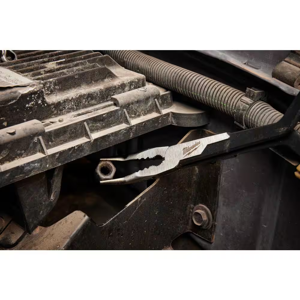 The cross-handle design helps the pliers reach in tight spaces Single-joint pliers provide maximum gripping force and control Jaws are designed with multi-function gripping zones The MILWAUKEE 13" Long Reach Straight Nose Pliers provide the best access and maximum gripping force*. These long-reach pliers feature a Deep-Reach Cross Handle design which delivers a wide jaw opening while maintaining a slim profile for extended reach in tight spaces. The single-joint pliers provide maximum gripping force and allow for more control when handling different materials and objects. These jaws are designed with multi-function gripping zones for common applications such as fasteners, washers, wires, and more. Milwaukee long-reach pliers feature a corrosion-resistant black oxide coating for increased durability and slip-resistant grips for better leverage. These pliers are backed by a limited lifetime warranty.