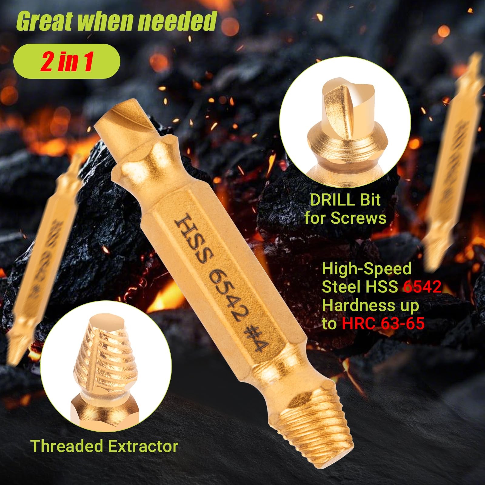 Screw Extractor Set, 13 Pieces Easy Out Screw Extractor Set and Left-Hand Drill Bit Set, Stripped Screw Extractor Set for Removing Damaged Screws, Broken Bolts, Studs High-quality materials: With titanium gold-plated surface treatment, rust-proof and corrosion-resistant. The spiral screw extractor is made of CR-MO steel, and the easy-out bolt extractor set is made of HSS 6542 to ensure sturdiness. And with laser-etched markings for easy identification, meeting the needs of screw extractor drill bits and broken bolt extractor kits. Wide Range of Sizes: Damaged Screw Extractor Set features 7PCS spiral screw extractors: 1#5/64", 1#5/64", 2#7/64", 2#7/64", 3#5/32", 4#1/4", 5#17/64", along with 6PCS double-head extractors: 0#, 1#, 2#, 2#, 3#, 4#. Easy to remove stuck, broken, or tightened tools. Broken bolt extractor kit removes damaged screws, whether working on wood or metal, saving you valuable time and effort. Tool Compatibility: Engineered to seamlessly integrate with electric drills, screwdriver bit holders, and wrenches, offering compatibility across a wide range of tools, including tap socket sets. Versatile Applications: Tailored for a variety of daily life uses, such as home repairs, car maintenance, construction projects, and metalworking. Designed to easily handle a variety of challenges, including stripped, broken or frozen screws, bolts, and nuts. Cool Gift Ideal: This an excellent gift choice for dad, husband, father, him, guy teens, adult, boyfriend, or son on Birthdays, Christmas, and Father's Day reflecting quality and practicality. Backed by exceptional after-sales service, ensuring complete customer satisfaction. Perfect for those seeking easy-out bolt extractor sets or stripped bolt extractors.