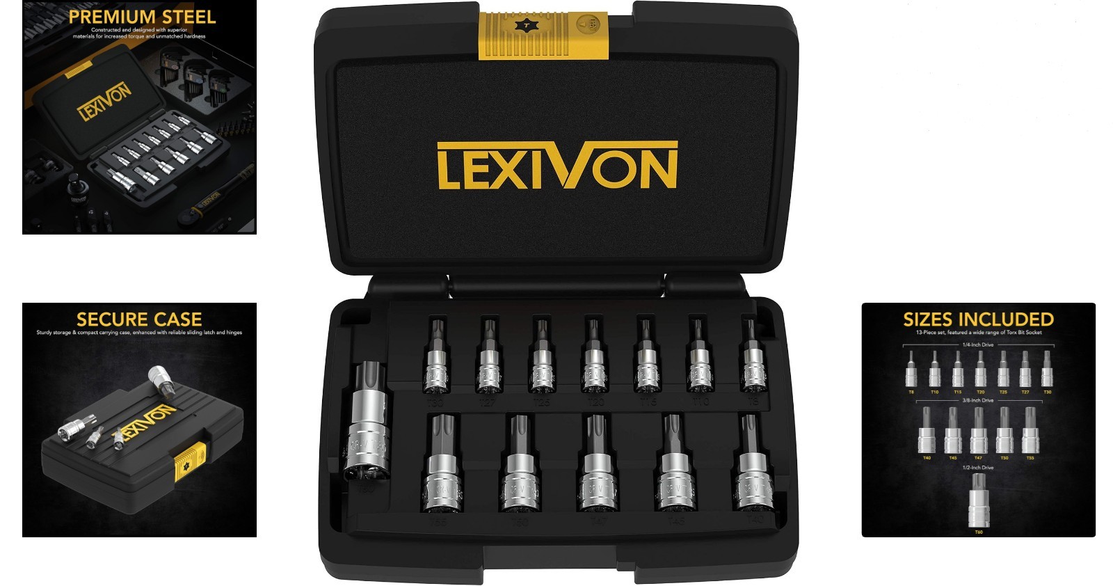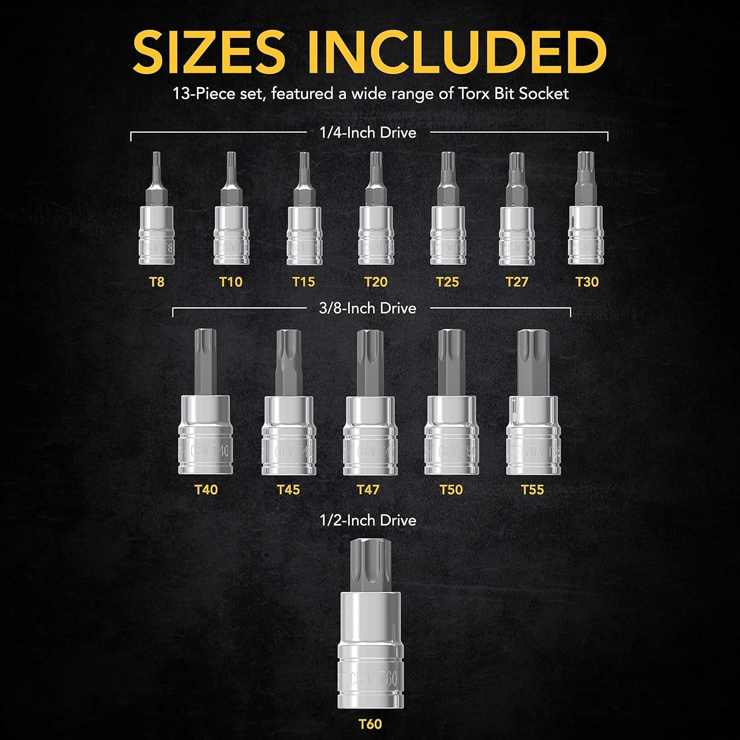 13-Piece Torx Bit Socket Set - S2 Alloy Steel, T8-T60 with Storage Case ‹ › ‹ › ‹ › ‹ › ‹ › ‹ › ‹ › ‹ › ‹ › 13-Piece Torx Bit Socket Set - S2 Alloy Steel, T8-T60 with Storage Case Elevate Your Tool Collection This 13-Piece Torx Bit Socket Set is designed for those who demand excellence. Crafted from materials, this set offers increased torque and unmatched hardness. Features: Durable Construction: Drop-forged, heat-treated S2 alloy steel bits reduce wear and tear, while hardened Chrome Vanadium steel sockets enhance turning power. Longevity: Fully polished, chrome-plated mirror finish sockets ensure complete rust and corrosion resistance. Comfortable Use: Precision chamfered bit ends allow for a smooth insert, with socket sizes stamped for quick recognition on both the bits and the heavy-duty storage case. Peace of Mind: Each tool meets and exceeds ANSI standards and is backed by a lifetime limited , ensuring your investment is protected. What You Receive: 13-Piece Torx Bit Socket Set - 1/4” Drive Sizes: T8, T10, T15, T20, T25, T27, T30 3/8” Drive Sizes: T40, T45, T47, T50, T55 1/2” Drive Size: T60 storage and carry case Why Choose Our Torx Bit Socket Set? This is the ultimate Torx/Star tool set, tailored for both DIY-ers and professionals. Ideal for use with manual torque tools, this bit set is essential for tasks ranging from bike repairs to automotive maintenance, and everything in between. Crafted using CNC technology for precision and durability, each bit is designed with chamfered edges for a flawless fit, ensuring not just efficiency but also care for your fasteners. Don’t settle for less; invest in a tool set that guarantees quality and reliability for seasons to come. Click ‘Add To Cart’ and transform your toolkit today! Shipping Free & Fast Shipping - We offer free shipping to most of the USA with a normal delivery time of 3-7 days. However, due to the current situation, additional delivery time (up to 3 weeks) may be required for some items. Alternative Carriers - We may use alternative carriers (e.g. USPS, FedEx, UPS, etc.) to ensure your package arrives safely and on time. Due to the use of multiple carriers, we are unable to provide a tracking number automatically. Handling Time - Orders are processed and shipped within 1-2 business days of receiving cleared payment. Shipping Restrictions - Shipping to Alaska, Hawaii, Puerto Rico, Guam, and other US territories may incur shipping charges or delivery restrictions. Please contact us before ordering, or your order can be refunded/cancelled. State Restrictions - There may be restrictions based on your state of purchase. For example, certain items may not be shipped to California due to state regulations. Contact for Tracking Updates - If you require tracking updates or have any concerns about the delivery of your order, please feel free to contact us, and we will be happy to assist you. Return 30-Day Hassle-Free Returns - We want you to be completely satisfied with your purchase. If you are not, you can return the item within 30 days of receiving it for a full refund or exchange. Easy Return Process - To start a return, simply contact us and we will provide you with a prepaid return shipping label and detailed instructions. Restocking Fee - There are no restocking fees for returns. However, the buyer is responsible for return shipping costs if the return is not due to a seller's error. Refund Processing Time - Refunds will be processed within 5 business days of receiving the returned item in its condition. Payment We accept all major credit cards, PayPal, and Apple Pay for your convenience. Your payment information is secure and encrypted to ensure a safe and seamless transaction. Please complete your payment within 3 days of purchase to avoid any delays in shipping. Feedback Your feedback is extremely important to us. We strive to provide the best products and customer service possible. If you are satisfied with your purchase, please take a moment to leave us a positive review. If you have any concerns or issues with your order, please contact us before leaving negative feedback. We are committed to resolving any problems and ensuring your satisfaction. Contact Us If you have any questions or concerns, please feel free to out to our customer support team. You can contact us through the eBay messaging system. We are available Monday to Friday, 9:00 am to 5:00 pm EST, and we will do our best to respond to your inquiry within 24 hours. Buy it now and enjoy a pleasant shopping experience! Manufacturer Part Number: Torx Bit Socket Set Unit Quantity: 1.0 Tools Included: Sockets,Torx Bits Size: T8-T60,T8,T10,T15,T20,T25,T27,T30,T40,T45,T47,T50,T55,T60 Socket Type: Standard Drive Type: Torx Drive Size: 1/4in. Surface Finish: Chrome Number of Pieces: 13