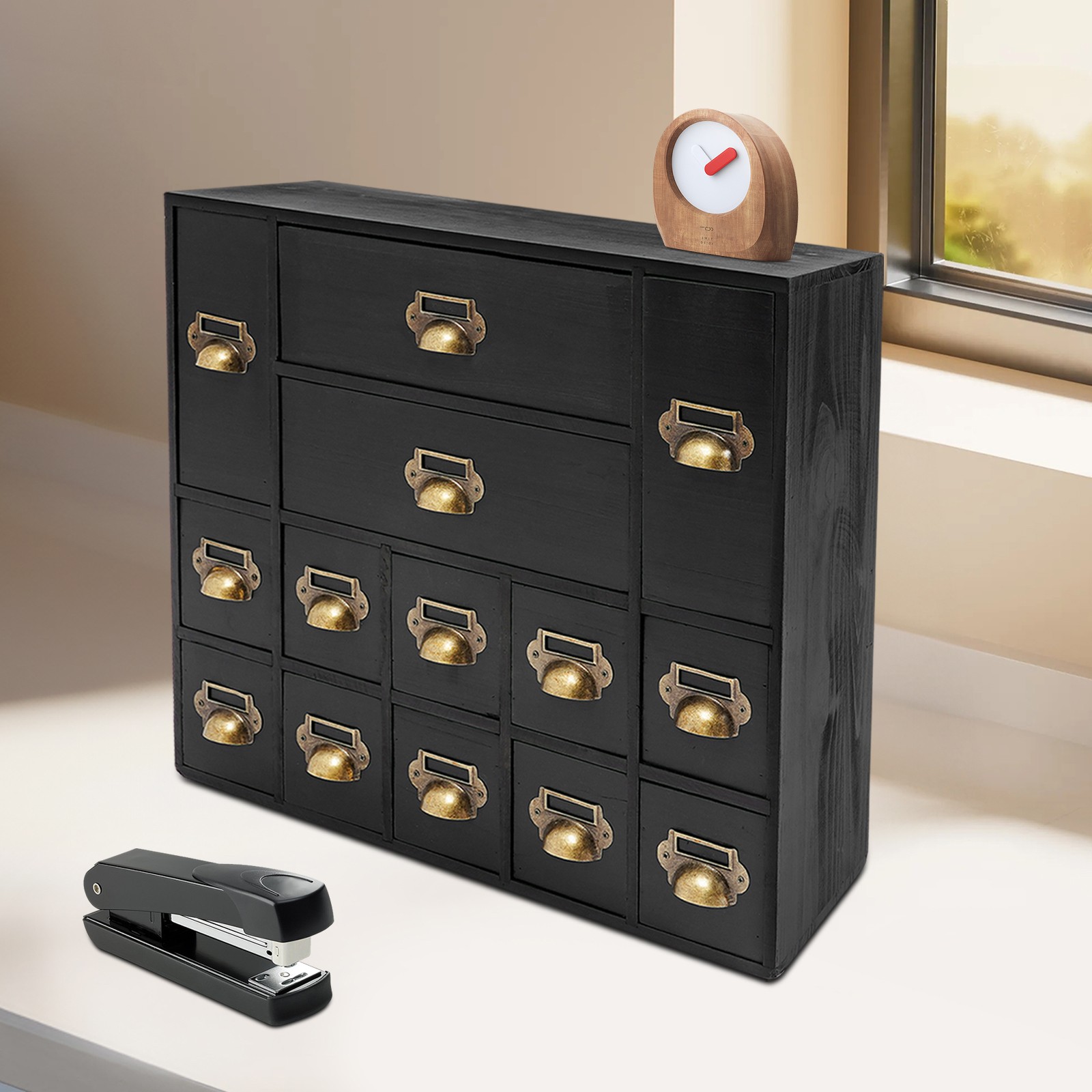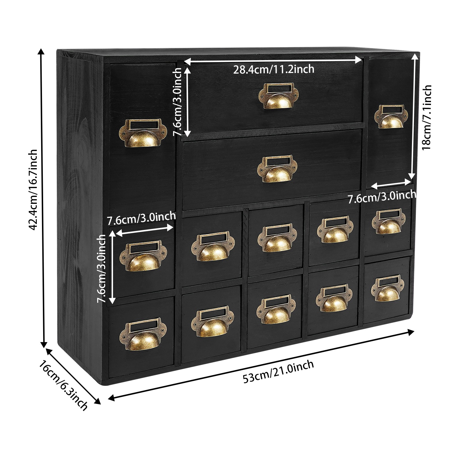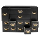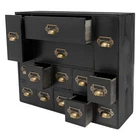 14 Drawers Black Vintage Organizer Apothecary Cabinet Dressers Label Holder Description Our storage drawer cabinet is an efficient storage furniture designed for homes, offices, and more. It combines practical design and premium materials and is designed to provide users with a storage solution that is both aesthetically pleasing and practical, helping you to better organize and manage your belongings. Key Features Made to Last: Premium iron and wood materials and exquisite polishing, sanding, and spraying paint processes make this product sturdy, scratch-resistant , impact-resistant , and not easy to fade and deform, ensuring long-term beauty and practicality. Large Capacity Storage: It provides 14 drawers in 3 different sizes to categorize and store herbs, tea bags, sugar packets, creamers, instant coffee, data cables, staplers, adhesive tapes, and many other small items, which is easy for you to manage. Vintage Style: The product adopts a classic vintage design with retro wood grain and elegant lines, which creates a strong sense of history and cultural atmosphere, adding a touch of sophistication to your home decor. Stable Structure: The rectangular structure increases the contact area with the tabletop, effectively prevents tipping, and ensures the stability of the product. Ready to Use: It does not require assembly, and you can start using it as soon as you receive it, saving time and effort. Effortless Cleaning: It has a smooth surface, a simple structure, and a dustproof drawer design, so you only need to wipe it clean with a towel. Ideal Gift: With excellent durability and practicability, it can be used as an ideal housewarming gift for parents, friends, and lovers so that they can also enjoy a more exquisite and convenient life. Good Customer Service: We aim to provide quality products and services. If you have problems, please feel free to contact us. We will reply and solve the problem for you as soon as possible. Details Practical Handles: They make pulling out drawers smoother and easier for you to access items. Label Frame: Each drawer is equipped with a labeling frame for better classification of herbs or items. Application This product can be used as a Chinese medicine or household medicine organizer, an organizer for various small crafts, a kitchen organizer for tea bags, sugar packets, creamer, instant coffee, etc., a desktop organizer for data cables, staplers, tape, and other small office supplies. Specification Color: Black Style: Vintage Material: Iron, Wood Process: Polishing, Sanding, Spraying Paint Mounting Type: Free Standing Number of Drawers: 14 Small Drawer Size: 13.5*7.6*7.6cm/5.3*3*3in Middle Drawer Size: 13.5*7.6*18cm/5.3*3*7.1in Large Drawer Size: 28.4*13.5*7.6cm/11.2*5.3*3in Overall Product Size: 53*16*42.4cm/21*6.3*16.7in Package Size: 54*17*43.4cm/21.26*6.69*17.09in Each Drawer Load Capacity: About 3kg/6.6lbs Gross Weight: 3kg/6.6lbs Net Weight: 2.5kg/5.51lbs Package Included 1* Drawers Storage Cabinet Notes Please check the product size carefully before ordering. Please allow the slight color difference caused by the shooting light and 1-3cm error due to manual measurement, and make sure you do not mind before ordering. Payment Delivery details Terms of sales About us Contact us Payment We accept ebay payment 。 Fees such as import duties, taxes are not included in the item price or shipping costs. These charges are the buyer's responsibility. Delivery details Shipping: 2-9 working days to: USA Terms of sales We maintain high standards of excellence and strive for hundred percent customer satisfaction. Feedback is very important to us. We hope that you contact us immediately before you give neutral or negative feedback, so that we can address your concerns. It is impossible to address issues if we do not know about them! About us Your satis faction is our ultimate goal. We work hard to earn your trust and future business. Our certified technicians have tested each item before shipping. The unit comes with 1 year limited warranty on all manufacturing defects. a) If you receive a defective item, you may return it or ask for a discount. Please contact us within 14 days after you receive the package. b) What you returned must be intact and in its original packaging as re? u. Customer is responsible for shipping costs of the returned item. c) We will cover the cost of shipping back t with the shipping rate indicated in the registration page. We will send you a new unit or refund the full payment you paid. Thank you. Contact us Business Hour Business Hour: Monday To Friday: 8:30 AM to 5:00 PM (Beijing China time) Due to time zones, our reply to your questions may not be immediately. But within above working time, we will reply your email within 24 hours. If it's non-workdays, please kindly be patient and wait till Monday. Please contact us with ebay message. Please feel free to contact us if you have any questions. Monday To Friday: 8:30 AM to 5:00 PM (Beijing China time) Due to time zones, our reply to your questions may not be immediately. But within above working time, we will reply your email within 24 hours. If it's non-workdays, please kindly be patient and wait till Monday. Please contact us with ebay message. Please feel free to contact us if you have any questions.
