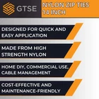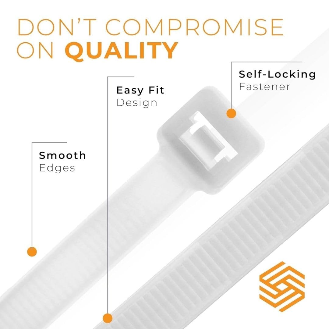What's in the package? You'll receive 100 durable, White/clear nylon zip ties, which can be used indoors and outdoors. Item specifics Dimensions (length x width): 14" x 0.19" Material: Durable and UV-resistant nylon polyamide 6/6 Color: Black Active working temperature: -40°F to +185°F Flammability rating: UL 94 class V2 Dielectric strength: 50,000 volts/mm More about this product Our 14" x 0.19" zip ties can be used for all sorts of practical projects, whether it's a quick and simple fix in the home or garden, or an extensive and time-sensitive commercial project that demands an effective solution, fast! PACKAGE CONTAINS: 100 long, UV resistant nylon zip ties SIZE: 14" x 0.19" (50lb Strength) COLOR: Black BUILT TO LAST: Made of industrial strength nylon 6/6, zip ties are able to withstand even the toughest weather conditions (working temperature -40°F to +185°F). Each zip tie features a durable self-locking mechanism which doesn't falter over time. LIMITLESS APPLICATIONS: Perfect for home DIY, commercial purposes, cable management and gardening. Our zip ties are proudly used by households, contractors and industry all over the world!