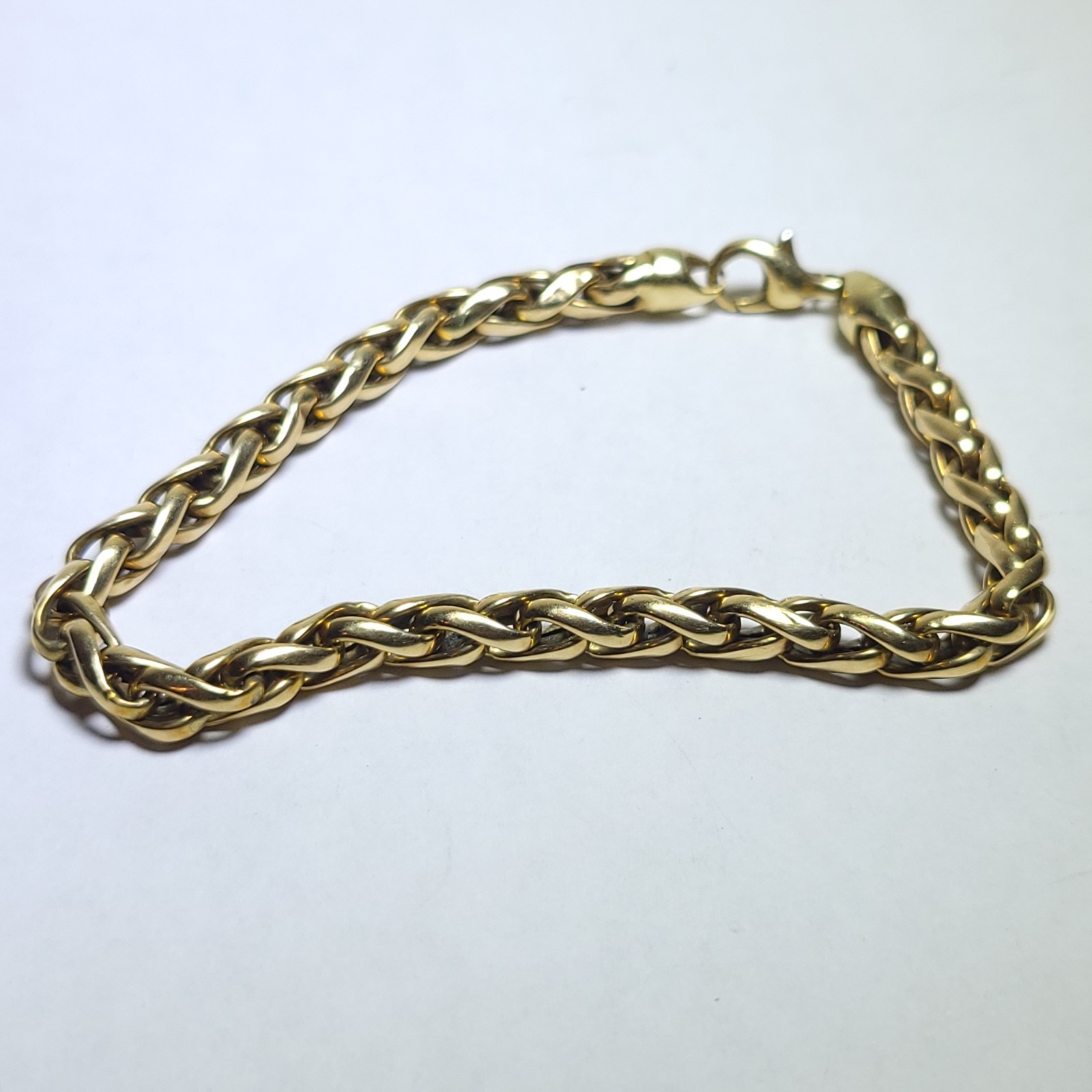 This 14 Karat gold bracelet features a hollow wheat / spiga chain design, measuring 7.5 inches in length. Crafted from high-quality yellow gold with a purity of 14k or 585, this elegant bracelet is the perfect accessory to add a touch of luxury to any outfit. The sleek and classic style makes it a versatile piece that can be worn for special occasions or everyday wear. Weighs 8.0g.