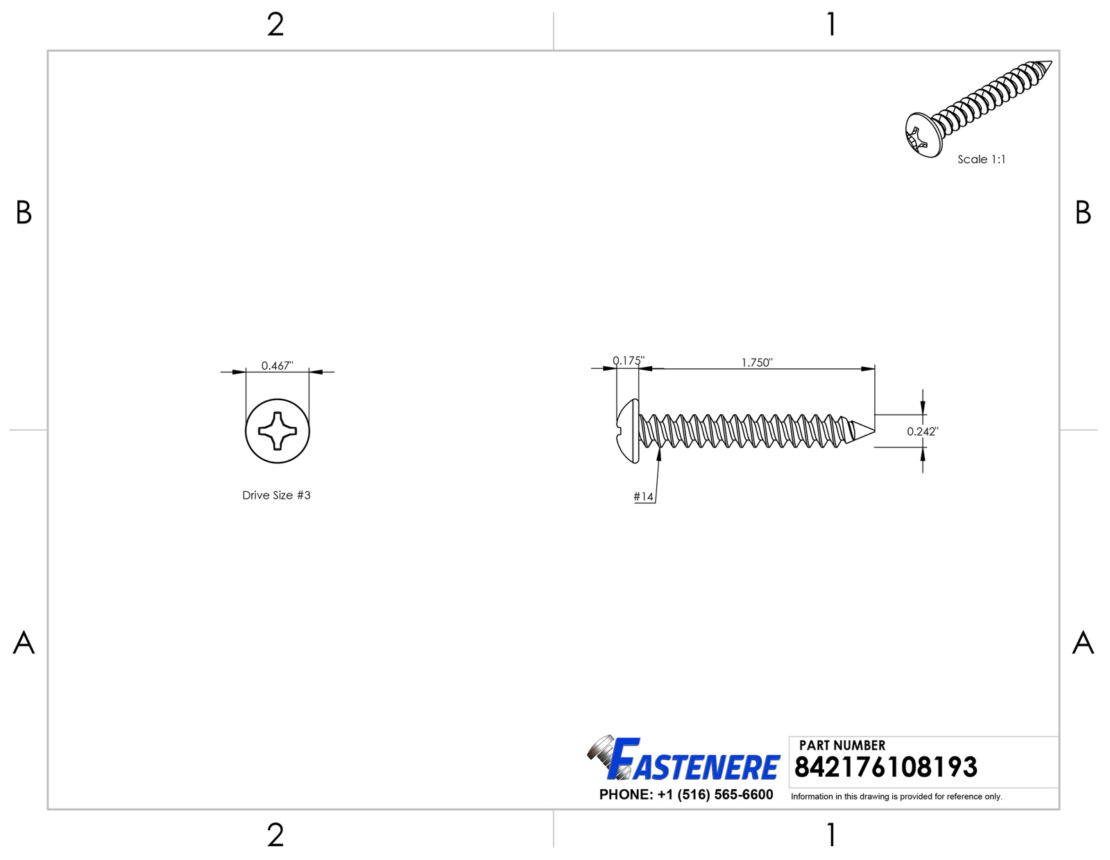 #14 x 1-3/4" Sheet Metal Screws Self Tapping Pan Head Stainless Steel Qty 2500 Sheet metal screws have sharp threads that cut into a material such as sheet metal, plastic or wood. They also make excellent fasteners for attaching metal hardware to wood because the fully threaded shank provides good retention in wood. About Self tapping Screws A self-tapping screw is a screw that can tap its own hole as it is driven into the material. Some self-tapping screws are also self-drilling, which means that, in addition to the tap-like flute in the leading threads, there is also a preliminary drill-like fluted tip that looks much like the tip of a center drill. The screws in this auction are not "Self Drilling" and do require a pilot hole for a thick gauge material General Product Information Head Style : Pan Drive Style : Phillips Drive Size : #3 Thread : #14 Length : 1-3/4" Material : Stainless Steel 18-8 Quantity of Fasteners in Package : 2500 Detailed Product Information: Head Diameter : 0.492" Head Height : 0.175" Thread Diameter : 0.250" Thread Coverage : Full Thread Thread Length : 1.75 Point Style : Type A Self-Tapping Key Notes: Stainless steel phillips pan head sheet metal screws will have no problem punching through a thin or light guage sheet metal but will require a pilot hole for a thicker guage metal; the phillips drive has a tendency to slip if there is too much torque applied during installation and these machine screws being made of a high quality stainless steel which is softer than other non corrosion resistant fasteners are also susceptible to stripping so it is recomended to use a slower speed or to set the clutch on the driver so when the machine screw is fastened completely the drill does not shred the phillips drive Phillips pan head sheet metal screws with a self tapping thread patern that forms its own threads in the material it is being screwed into and is mainly used for attatching two pieces of metal together but also works great in wood and plexiglass because of the coarse thread Pan heads have a domed top with a flat load bearing surface on the underside that will hold materials being fastened firmly together Made from stainless steel grade 18-8 which offers a high level of chemical and corrosion resistance that will out perform and out last all zinc plated fasteners for years with out the need to perform costly and time consuming maintenance; 18-8 stainless steel pan head sheet metal screws are a better choice than 410 self drilling screws in out door applications that will be visible because unlike 410 stainless with a high iron content these screws have a low iron content and will not rust or turn red Fastenere brand stainless steel sheet metal screws offer the corrosion resistance and strength that makes them the best choice for an application that is exposed to a wet or damp enviroment and will withstand the test of time Shipping: All orders placed before 3:30 pm EST Will Ship Same Day Tracking is provided on ALL Orders Priority Mail Shipping service is offered at a discount of only $3.95 UPS Ground UPS Next Day Air is available, Please inquire for pricing Returns : ALL returns are accepted if returned within 60 days. Money Back or exchange guaranteed. NO Restocking Fees. For YOU, we constantly strive to find ways to improve our performance.