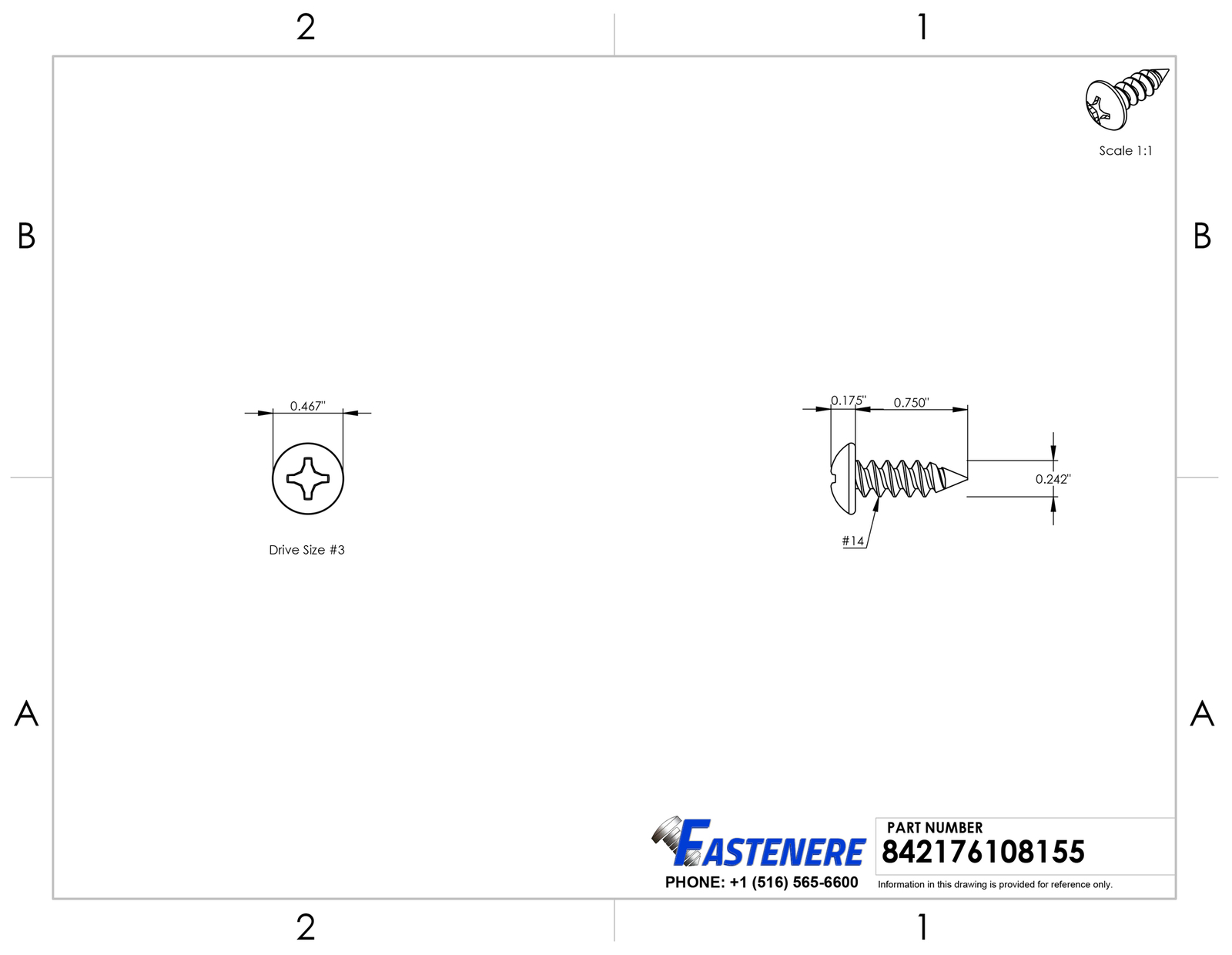 #14 x 3/4" Sheet Metal Screws Self Tapping Pan Head Stainless Steel Qty 2500 Sheet metal screws have sharp threads that cut into a material such as sheet metal, plastic or wood. They also make excellent fasteners for attaching metal hardware to wood because the fully threaded shank provides good retention in wood. About Self tapping Screws A self-tapping screw is a screw that can tap its own hole as it is driven into the material. Some self-tapping screws are also self-drilling, which means that, in addition to the tap-like flute in the leading threads, there is also a preliminary drill-like fluted tip that looks much like the tip of a center drill. The screws in this auction are not "Self Drilling" and do require a pilot hole for a thick gauge material General Product Information Head Style : Pan Drive Style : Phillips Drive Size : #3 Thread : #14 Length : 3/4" Material : Stainless Steel 18-8 Quantity of Fasteners in Package : 2500 Detailed Product Information: Head Diameter : 0.492" Head Height : 0.175" Thread Diameter : 0.250" Thread Coverage : Full Thread Thread Length : 0.75 Point Style : Type A Self-Tapping Key Notes: Stainless steel phillips pan head sheet metal screws will have no problem punching through a thin or light guage sheet metal but will require a pilot hole for a thicker guage metal; the phillips drive has a tendency to slip if there is too much torque applied during installation and these machine screws being made of a high quality stainless steel which is softer than other non corrosion resistant fasteners are also susceptible to stripping so it is recomended to use a slower speed or to set the clutch on the driver so when the machine screw is fastened completely the drill does not shred the phillips drive Phillips pan head sheet metal screws with a self tapping thread patern that forms its own threads in the material it is being screwed into and is mainly used for attatching two pieces of metal together but also works great in wood and plexiglass because of the coarse thread Pan heads have a domed top with a flat load bearing surface on the underside that will hold materials being fastened firmly together Made from stainless steel grade 18-8 which offers a high level of chemical and corrosion resistance that will out perform and out last all zinc plated fasteners for years with out the need to perform costly and time consuming maintenance; 18-8 stainless steel pan head sheet metal screws are a better choice than 410 self drilling screws in out door applications that will be visible because unlike 410 stainless with a high iron content these screws have a low iron content and will not rust or turn red Fastenere brand stainless steel sheet metal screws offer the corrosion resistance and strength that makes them the best choice for an application that is exposed to a wet or damp enviroment and will withstand the test of time Shipping: All orders placed before 3:30 pm EST Will Ship Same Day Tracking is provided on ALL Orders Priority Mail Shipping service is offered at a discount of only $3.95 UPS Ground UPS Next Day Air is available, Please inquire for pricing Returns : ALL returns are accepted if returned within 60 days. Money Back or exchange guaranteed. NO Restocking Fees. For YOU, we constantly strive to find ways to improve our performance.