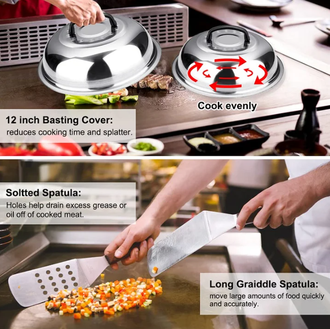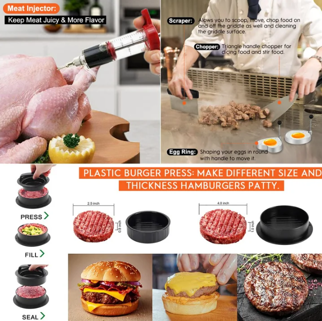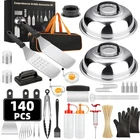 Complete 140PCS BBQ Griddle Accessories Kit for Blackstone & Camp Chef Grills This all-in-one griddle accessories kit includes everything you need to cook like a pro on your flat top grill. Whether you're flipping burgers, searing steaks, or cooking breakfast outdoors, this set is perfect for both beginners and grill masters alike. Comprehensive Grill Tool Set: Includes spatulas, chopper, scraper, basting covers, burger press, tongs, fork, gloves, oil bottles, meat injector, egg rings, spice shakers, skewers, corn holders, and more – totaling 140 pieces. Perfect for every grilling task from prep to clean-up. Premium Stainless Steel Construction: Crafted with high-quality, extra-thick 304 stainless steel, the tools are BPA-free, rust-resistant, and built to last. Designed for durability and daily use, they won’t bend or break easily under high heat. Double the Efficiency: Comes with two basting covers and two heat-resistant silicone gloves, making it easy for two people to grill at the same time. Reduce cooking time while staying safe from oil splatter and heat. Essential Tools for Serious Griddling: The long spatulas and scrapers are ideal for flipping and chopping large portions, while the burger press helps you create uniform patties in different sizes. Egg rings add a fun touch to breakfast, and the fish turner is perfect for delicate items. Perfect Gift Choice: Packaged in a convenient carry bag, this grill set makes a great gift for birthdays, Father’s Day, Christmas, and any holiday for the BBQ enthusiast in your life. Backed by excellent customer service and satisfaction guarantee – this is the ultimate kit for outdoor cooking, camping, tailgating, and backyard grilling.