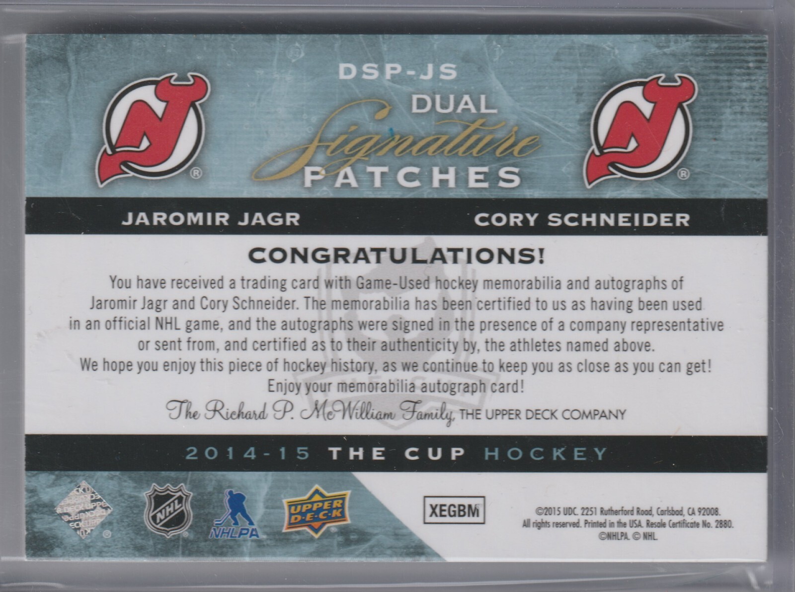 ***Due to the Upcoming Canada Post Strike, we will be utilizing ChitChats as our courier service. We have updated our shipping costs to concede with ChitChats rates*** Here's another auction from Wests Sports Cards - Edmonton's Finest Sports Cards & Collectibles hobby store !! 2014-25 Jaromir Jagr & Cory Schneider Auto 32/35 UD The Cup Dual Signature Patches Card #DSP-JS DESCRIPTION OF ITEM - this card is in near-mint to mint condition, pulled straight from the pack , a great looking signature memorabilia card, simply amazing !! VERY IMPORTANT PLEASE READ SHIPPING TERMS - winner to pay S&H anywhere in Canada for standard letter air mail !! - Canadian residents add 5% GST - winner to pay S&H anywhere in USA for standard letter air mail !! - international orders pay S&H anywhere in the world for standard letter air mail !! - Shipping on multiple cards; $0.50/card after the first and Lots: $1.00/lot !! - "We will ship 1-2 days after payment is received so please be patient as you will get your item and if you are still uncertain please feel free to email or call us , my phone number is provided in my store , Please Note Buyers in the USA your item will take 2-4 weeks for delivery from this part of CANADA !!! Please Note International Buyers your item can take 2-6 Weeks for delivery from this party of CANADA !!! IF THE TOTAL AMOUNT IS OR MORE THAN $75, YOU MUST PURCHASE SHIPPING WHICH PROVIDES A TRACKING NUMBER, WHICH IS THE SECOND OPTION ON THE SHIPPING DETAILS, or WAIT FOR AN INVOICE !!! - Expedited Post Shipping is $18.00 within Canada - Expedited Post Shipping is $25.00 to the USA(under $250) - Express Post Shipping is $30.00 to the USA(over $250) - Registered Mail is $30.00 anywhere else in the world (amounts $75 or over) !! PAYMENT OPTIONS - we accept paypal, visa or master card (phone number is provided below) - Please check out our other auctions for other great singles and boxes and save of shipping & please email me or call me if you have any questions or concerns at (780) 477-2102 !