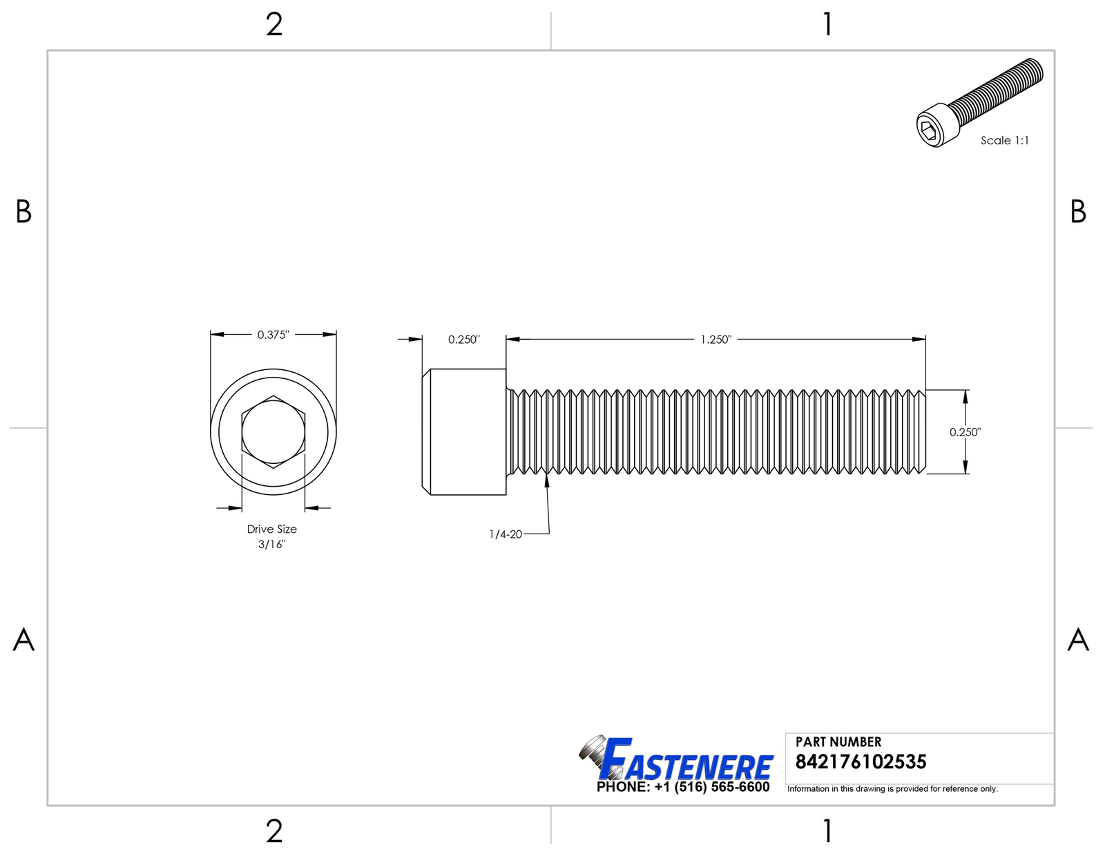 1/4-20 x 1-1/4" Socket Head Cap Screws Allen Hex Bolts Stainless Steel Qty 500 Socket Cap Screws are reliable and durable and are used in many applications. They are available in a variety of head styles and materials. With a high cylindrical head, socket cap head fasteners have a recessed driving area and offer high hold power at high torque levels. Hex socket drive systems are driven by hex wrenches or power tools with hexagonal bits. A threaded fastener's size name includes information about the major external diameter, followed by the threads per inch, which indicates if it is coarse or fine. Coarse threads are better when working with brittle materials; they are sturdier and are easier to thread and unthread compared to fine. Coarse threading also allows for thicker coatings and platings General Product Information Head Style : Socket Cap Drive Style : Allen Hex Key Drive Size : 3/16" Thread : 1/4-20 Length : 1-1/4" Quantity of Fasteners in Package : 500 Detailed Product Information: Head Diameter : 3/8" Head Height : 0.250" Thread Diameter : 0.250" Threads Per Inch (TPI) : 20 Coarse or Fine Thread : Coarse Thread Coverage : Full Thread Thread Length : 1.250 Key Notes: Socket head cap screws are the best choice for applications with a limited space due to the internal hexagon slot that allows them to be used in locations where externally wrenched fasteners are not desireable; The head height of a socket head cap screw is equal to the diameter of the body Socket cap screws offer industrial reliability and safety making them the chosen fastener in critical vehicle applications machine tools earth moving and mining equipment due to their superior strength and advanced design Compared to ordinary fasteners these socket head cap screws can achieve the same clamping force in a joint with fewer used allowing for less holes to be drilled and tapped which provides a weight reduction as well a smaller foot print and require much less installation effort thus saving valuable time Hex shaped recess in the head provides a driving surface that has increased protection against damage and has six sides of contact surface for more torque that professionals choose to use over hex bolts due to quality issues or repeated stripping with hex head cap screws Fastenere socket head cap screws are made from a grade 18-8 stainless steel which offers an excellent resistance to rust and corrosion from acids salt solutions and the atmosphere making for a superior product that will not succumb to scaling or rust while also providing good shock and impact resistance in extreme temperatures Shipping: All orders placed before 3:30 pm EST Will Ship Same Day Tracking is provided on ALL Orders Priority Mail Shipping service is offered at a discount of only $3.95 UPS Ground UPS Next Day Air is available, Please inquire for pricing Returns : ALL returns are accepted if returned within 60 days. Money Back or exchange guaranteed. NO Restocking Fees. For YOU, we constantly strive to find ways of improving our performance.