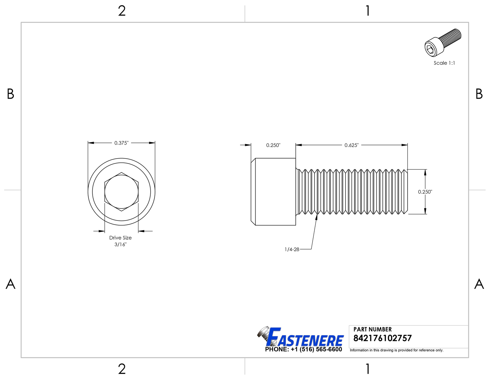 1/4-28 x 5/8" Socket Head Cap Screws Allen Hex Bolts Stainless Steel Qty 100 Socket Cap Screws are reliable and durable and are used in many applications. They are available in a variety of head styles and materials. With a high cylindrical head, socket cap head fasteners have a recessed driving area and offer high hold power at high torque levels. Hex socket drive systems are driven by hex wrenches or power tools with hexagonal bits. A threaded fastener's size name includes information about the major external diameter, followed by the threads per inch, which indicates if it is coarse or fine. Coarse threads are better when working with brittle materials; they are sturdier and are easier to thread and unthread compared to fine. Coarse threading also allows for thicker coatings and platings General Product Information Head Style : Socket Cap Drive Style : Allen Hex Key Drive Size : 3/16" Thread : 1/4-28 Length : 5/8" Quantity of Fasteners in Package : 100 Detailed Product Information: Head Diameter : 3/8" Head Height : 0.250" Thread Diameter : 0.250" Threads Per Inch (TPI) : 28 Coarse or Fine Thread : Fine Thread Coverage : Full Thread Thread Length : 0.625 Key Notes: Socket head cap screws are the best choice for applications with a limited space due to the internal hexagon slot that allows them to be used in locations where externally wrenched fasteners are not desireable; The head height of a socket head cap screw is equal to the diameter of the body Socket cap screws offer industrial reliability and safety making them the chosen fastener in critical vehicle applications machine tools earth moving and mining equipment due to their superior strength and advanced design Compared to ordinary fasteners these socket head cap screws can achieve the same clamping force in a joint with fewer used allowing for less holes to be drilled and tapped which provides a weight reduction as well a smaller foot print and require much less installation effort thus saving valuable time Hex shaped recess in the head provides a driving surface that has increased protection against damage and has six sides of contact surface for more torque that professionals choose to use over hex bolts due to quality issues or repeated stripping with hex head cap screws Fastenere socket head cap screws are made from a grade 18-8 stainless steel which offers an excellent resistance to rust and corrosion from acids salt solutions and the atmosphere making for a superior product that will not succumb to scaling or rust while also providing good shock and impact resistance in extreme temperatures Shipping: All orders placed before 3:30 pm EST Will Ship Same Day Tracking is provided on ALL Orders Priority Mail Shipping service is offered at a discount of only $3.95 UPS Ground UPS Next Day Air is available, Please inquire for pricing Returns : ALL returns are accepted if returned within 60 days. Money Back or exchange guaranteed. NO Restocking Fees. For YOU, we constantly strive to find ways of improving our performance.