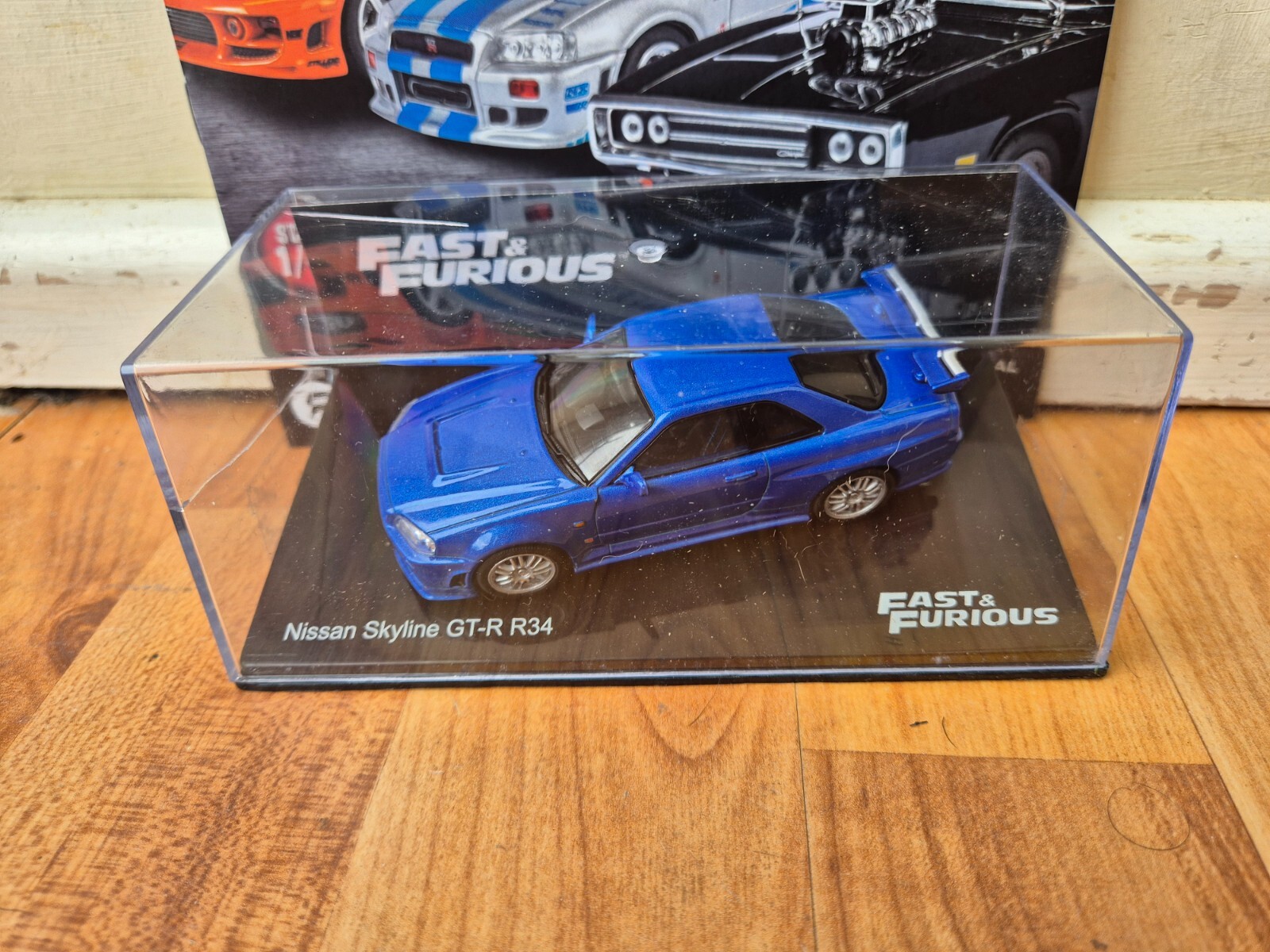YOU ARE BUYING A NISSAN SKYLINE GT-R R34 DIECAST MODEL CAR FROM THE FAST & FURIOUS CAR COLLECTION. GOOD CONDITION ON STAND WITH PLASTIC CASE. CASE HAS A FEW CRACKS. CAR IS EXCELLENT COMES WITH CORRESPONDING MAGAZINE AS RELEASED BY ALTAYA / FANHOME CAR LOOKS HIGHLY REALISTIC, PROFESSIONALLY SCULPTED. MOUNTED ON STAND WITH NAME OF CAR. THE MODEL HAS GREAT DETAIL VERY NICE MODEL 1/43 SCALE. APPROX 8CM LONG WITH ROLLING WHEELS DO NOT MISS OUT CHECK OUT THE OTHER ITEMS IN MY SHOP - AS HUGE POSTAGE DISCOUNTS ARE OFFERED FOR MULTIPLE BUYS