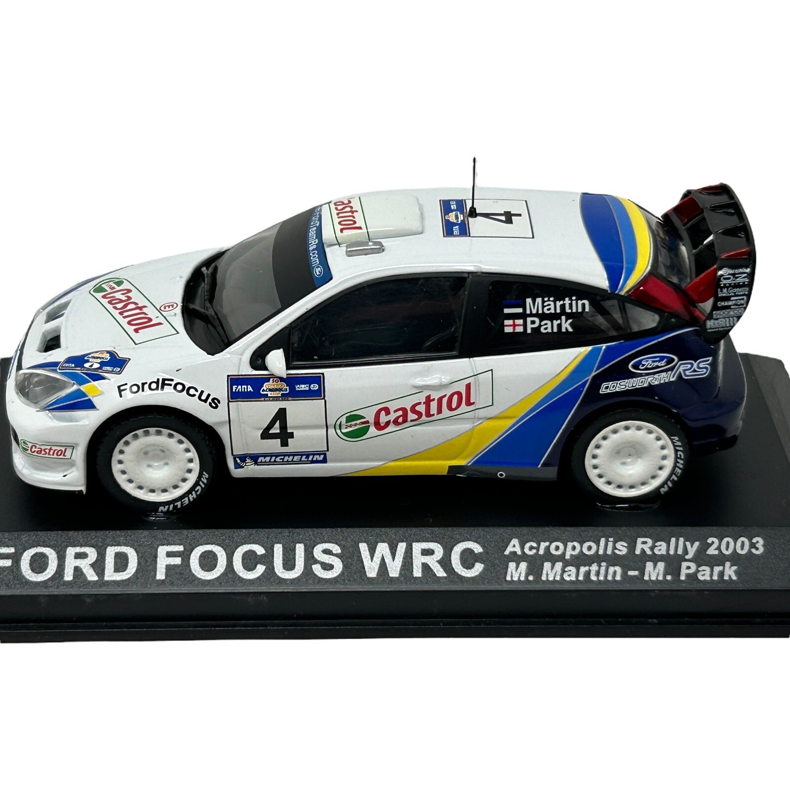 Ford Focus RS WRC Acropolis Rally 2003 Markko Martin Michael Park Diecast Race Car Motorsports Auto Racing World Rally Championship 1/43 Altaya White Condition: Case has a chip, tires are sticky, and they have somehow melted dents into the platform. No other flaws noticed. See photos.